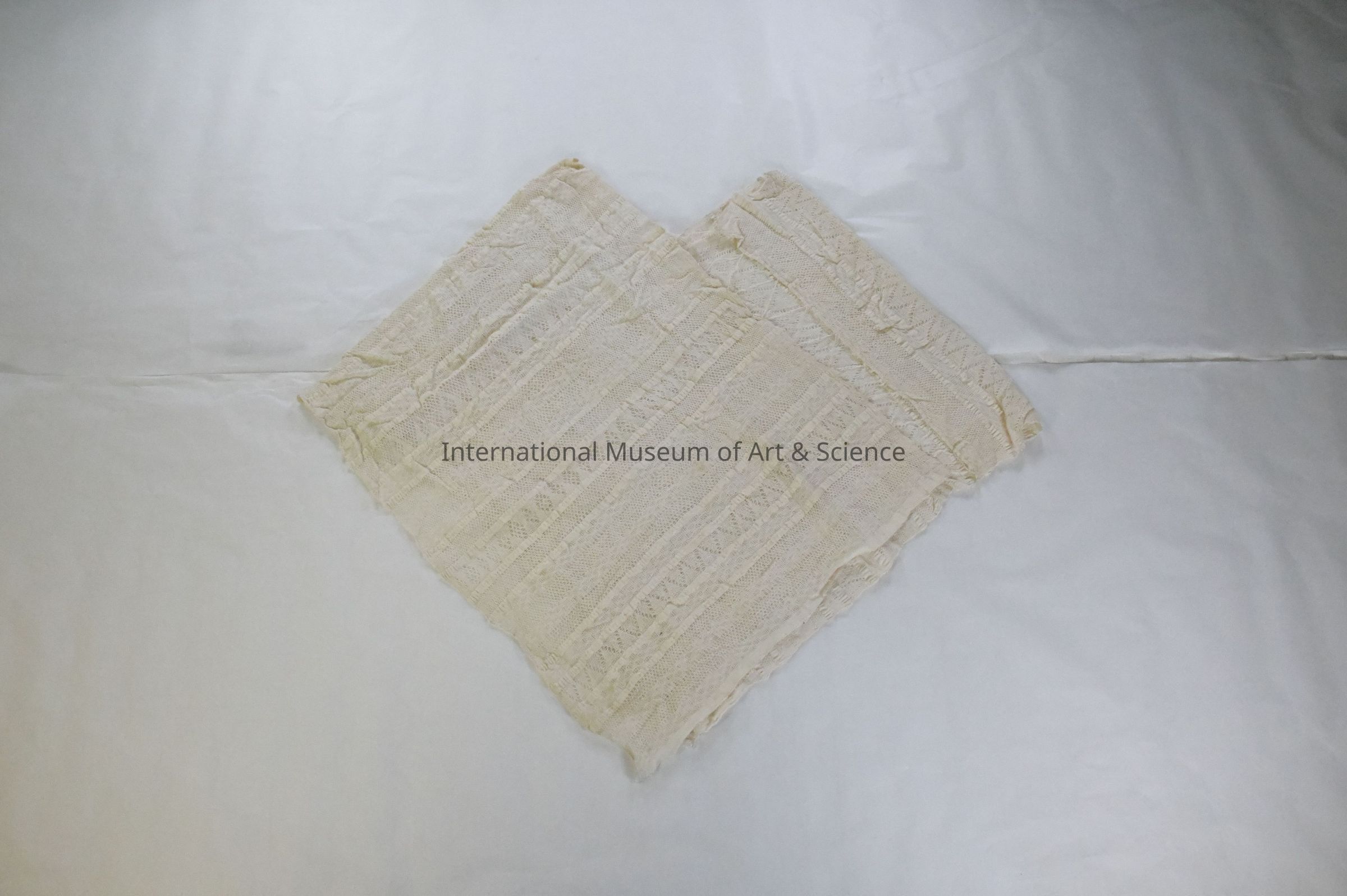 This is an unfinished quexquemitl composed of two off-white woven lienzos made of cotton. Each panel has been created on a backstrap loom using alternating bands of plain weave and open gauze weave, interspersed with puckered textures. The textile shows an expert use of four-selvage weaving, indicating complete loom-finished edges on all sides. The two rectangular panels are loosely joined at a right angle, a preparatory step before the final tailoring into the distinctive poncho-like quexquemitl form. The weaving features highly regular patterns of lace-like voids and puckers that lend the textile both breathability and ornamental complexity.Ethnography