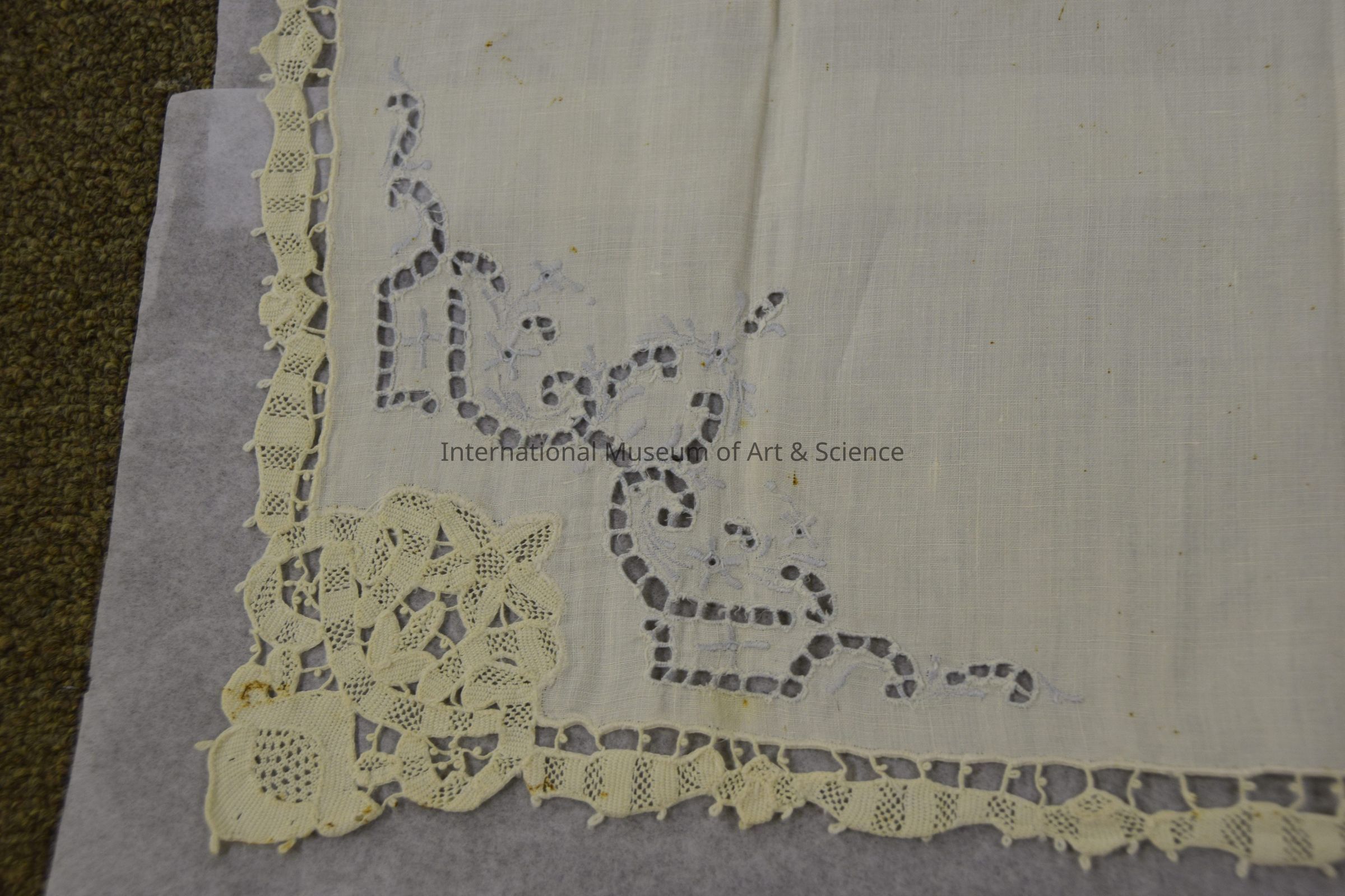 Napkin. Part of a set of 23 napkins with a matching tablecloth. It is a square, white linen napkin with an embroidery design on one corner, and a handmade lace tape edging all around. The most decorated corner has a lace insertion design that cuts into the white linen corner, and a cutwork embroidery done in a faint light blue thread. This cutwork design has scrolling and 7 flowers. The hand-made edging has buttonhole stitching, and is floral & scalloped to match tablecloth.
