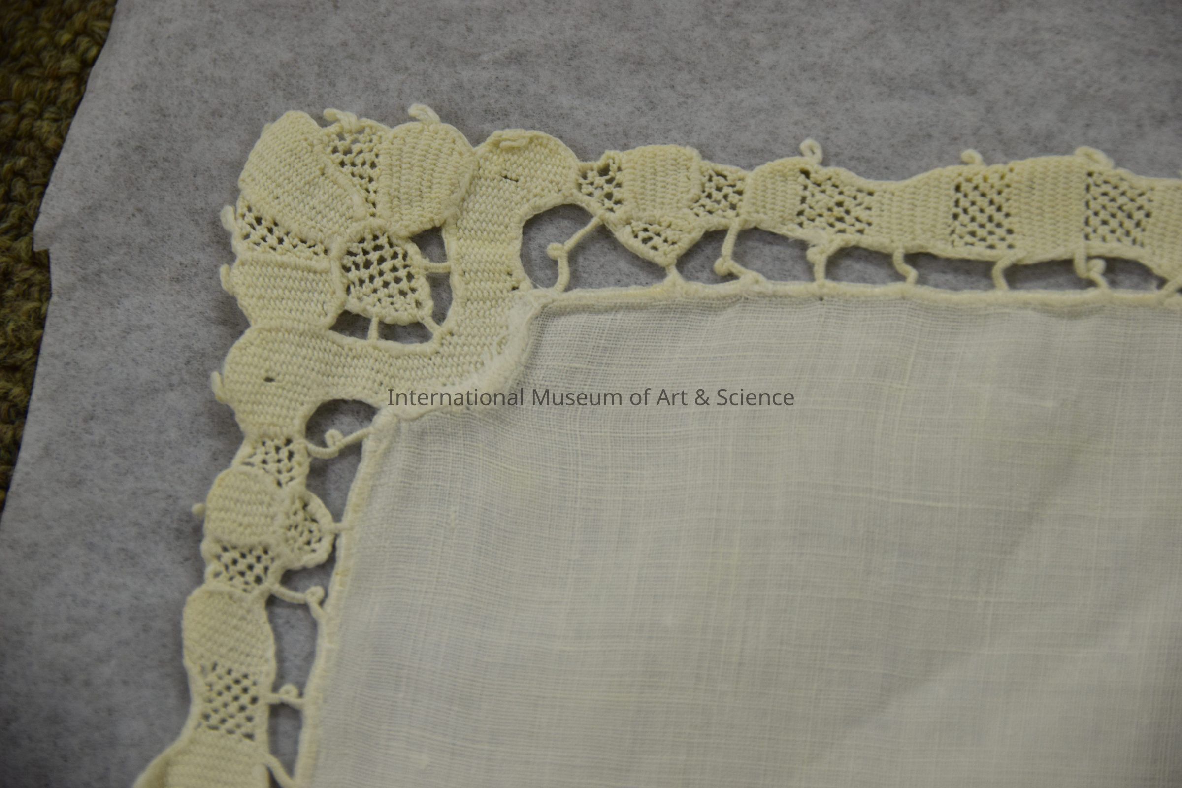 Napkin. Part of a set of 23 napkins with a matching tablecloth. It is a square, white linen napkin with an embroidery design on one corner, and a handmade lace tape edging all around. The most decorated corner has a lace insertion design that cuts into the white linen corner, and a cutwork embroidery done in a faint light blue thread. This cutwork design has scrolling and 7 flowers. The hand-made edging has buttonhole stitching, and is floral & scalloped to match tablecloth.