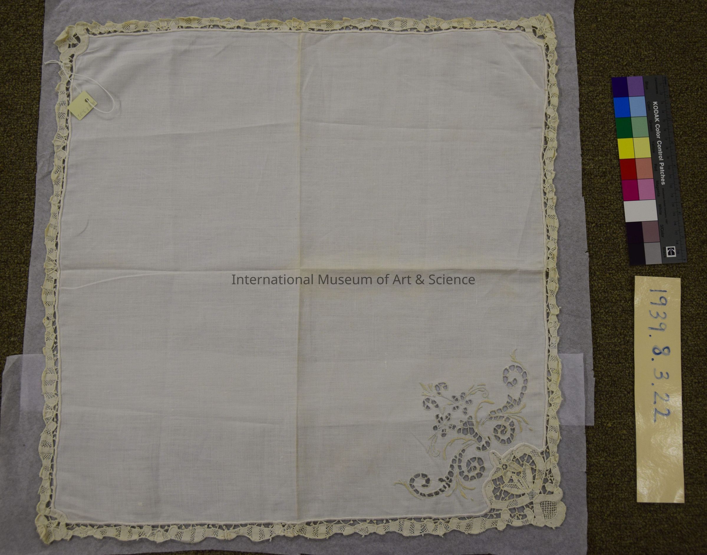 Napkin. Part of a set of 23 napkins with a matching tablecloth. It is a square, white linen napkin with an embroidery design on one corner, and a handmade lace tape edging all around. The most decorated corner has a lace insertion design that cuts into the white linen corner, and a cutwork embroidery done in a faint light blue thread. This cutwork design has scrolling and 2 flowers. The hand-made edging has buttonhole stitching, and is floral & scalloped to match tablecloth.