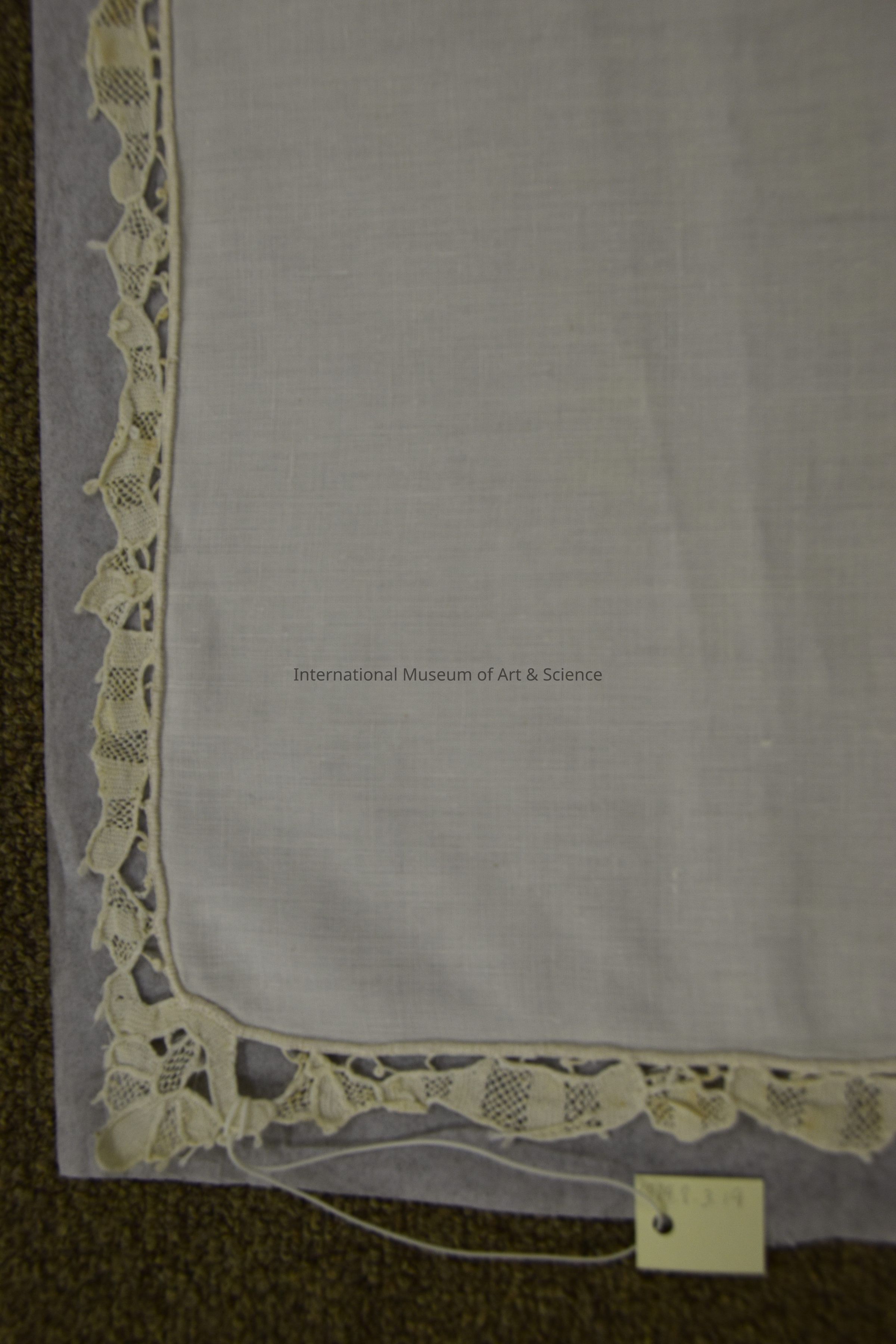 Napkin. Part of a set of 23 napkins with a matching tablecloth. It is a square, white linen napkin with an embroidery design on one corner, and a handmade lace tape edging all around. The most decorated corner has a lace insertion design that cuts into the white linen corner, and a cutwork embroidery done in a faint light blue thread. This cutwork design has scrolling and 2 flowers. The hand-made edging has buttonhole stitching, and is floral & scalloped to match tablecloth.