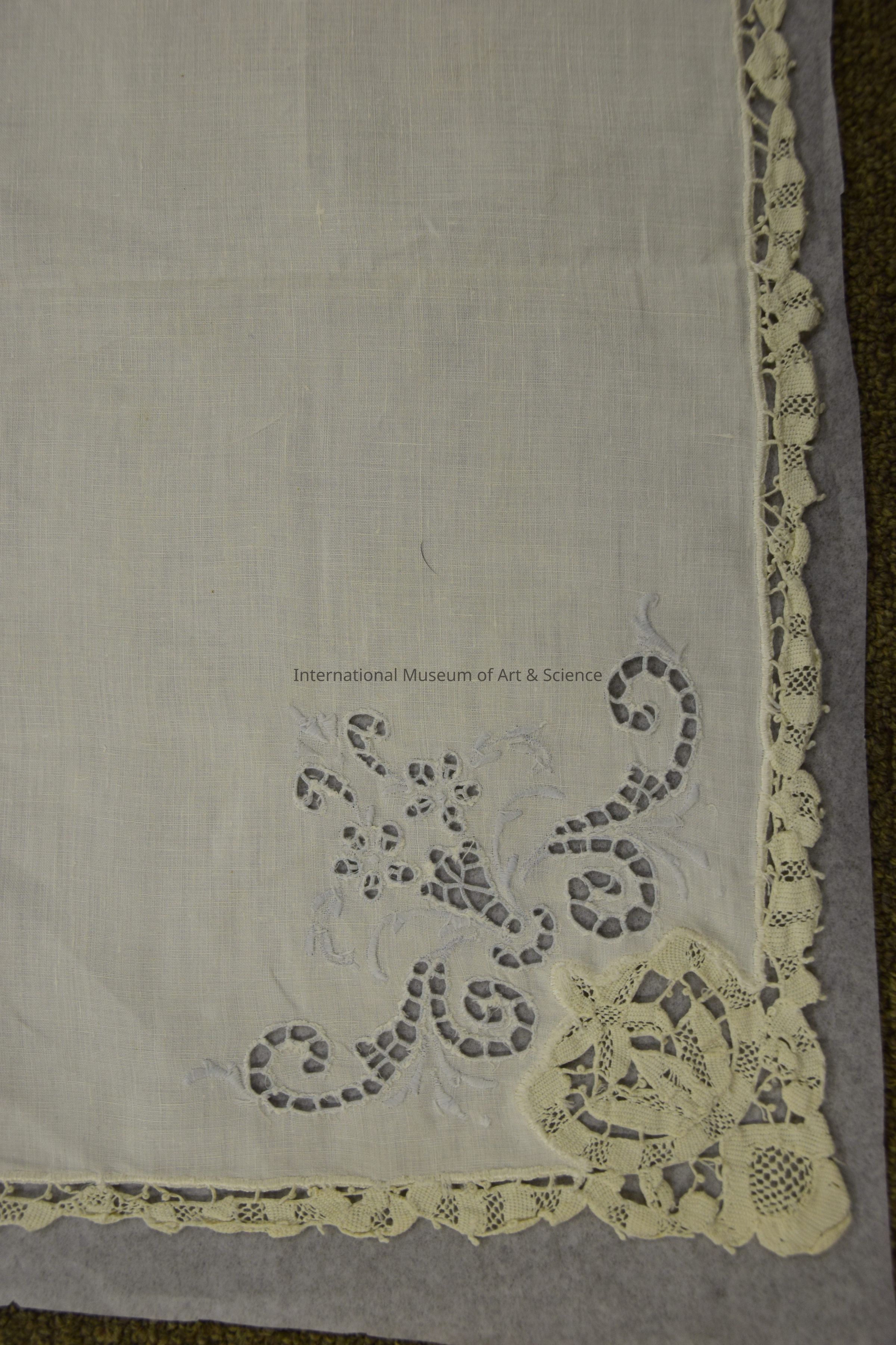 Napkin. Part of a set of 23 napkins with a matching tablecloth. It is a square, white linen napkin with an embroidery design on one corner, and a handmade lace tape edging all around. The most decorated corner has a lace insertion design that cuts into the white linen corner, and a cutwork embroidery done in a faint light blue thread. This cutwork design has scrolling and 2 flowers. The hand-made edging has buttonhole stitching, and is floral & scalloped to match tablecloth.