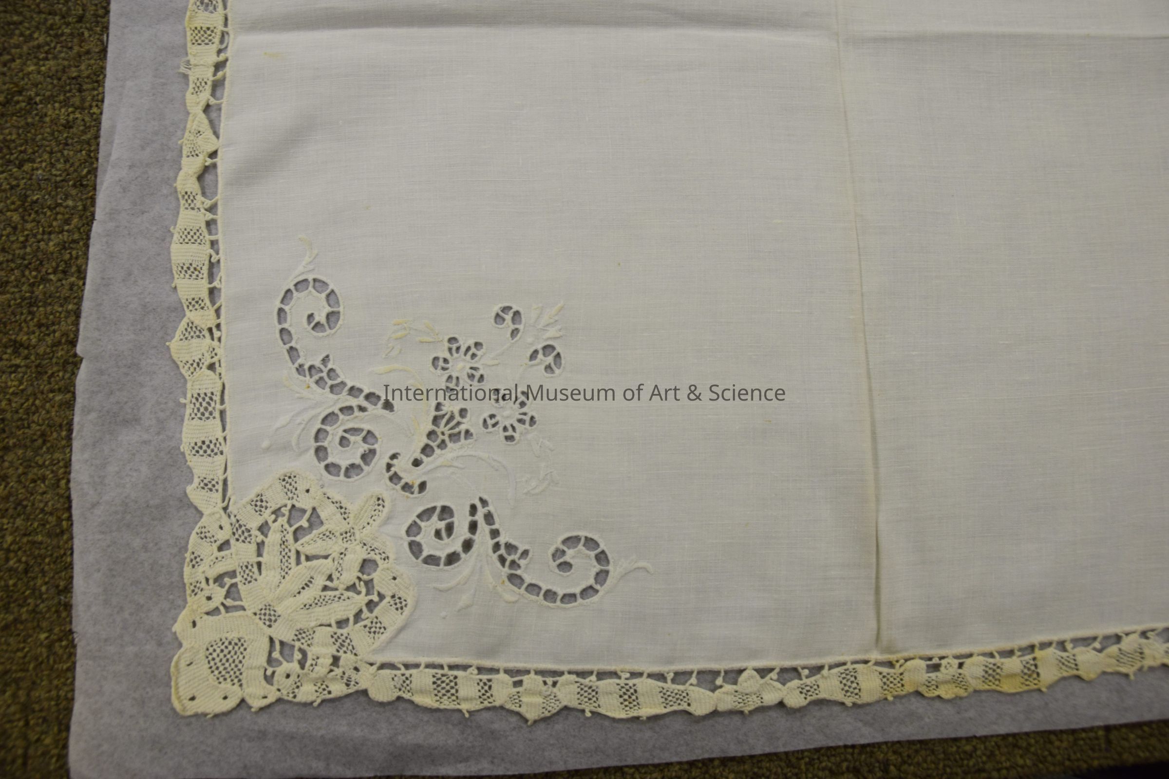 Napkin. Part of a set of 23 napkins with a matching tablecloth. It is a square, white linen napkin with an embroidery design on one corner, and a handmade lace tape edging all around. The most decorated corner has a lace insertion design that cuts into the white linen corner, and a cutwork embroidery done in a faint light blue thread. This cutwork design has scrolling and 2 flowers. The hand-made edging has buttonhole stitching, and is floral & scalloped to match tablecloth.