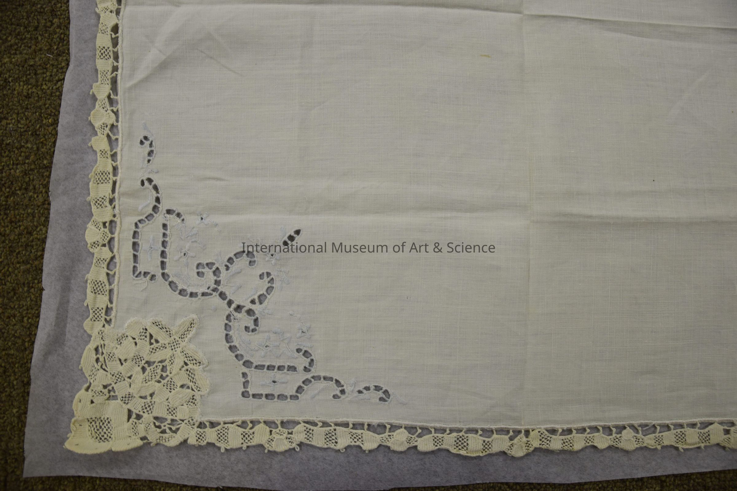 Napkin. Part of a set of 23 napkins with a matching tablecloth. It is a square, white linen napkin with an embroidery design on one corner, and a handmade lace tape edging all around. The most decorated corner has a lace insertion design that cuts into the white linen corner, and a cutwork embroidery done in a faint light blue thread. This cutwork design has scrolling and 7 flowers. The hand-made edging has buttonhole stitching, and is floral & scalloped to match tablecloth.