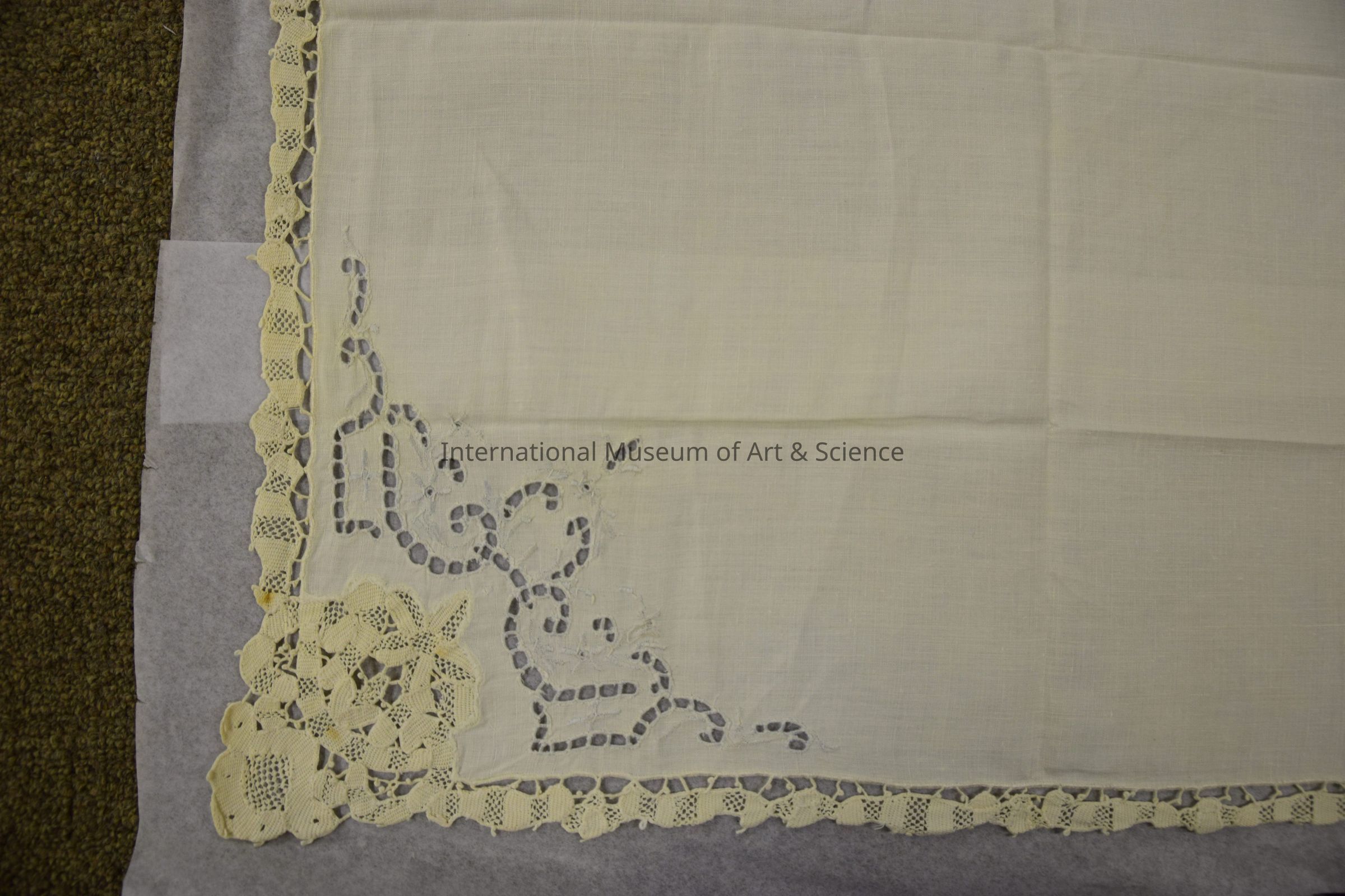 Napkin. Part of a set of 23 napkins with a matching tablecloth. It is a square, white linen napkin with an embroidery design on one corner, and a handmade lace tape edging all around. The most decorated corner has a lace insertion design that cuts into the white linen corner, and a cutwork embroidery done in a faint light blue thread. This cutwork design has scrolling and 7 flowers. The hand-made edging has buttonhole stitching, and is floral & scalloped to match tablecloth.