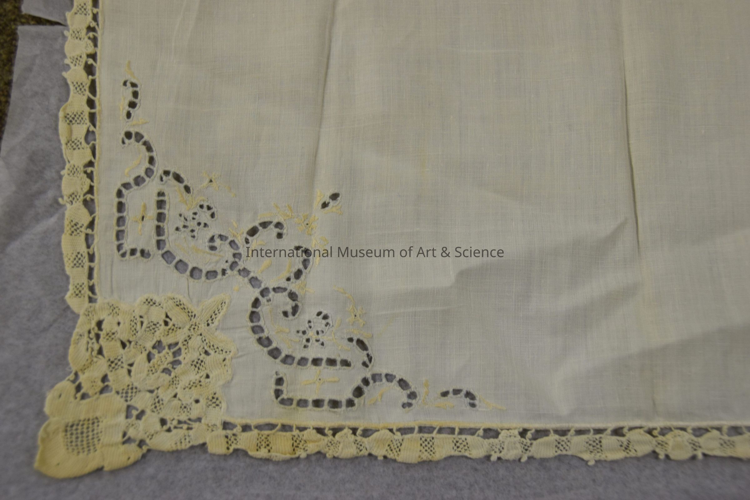 Napkin. Part of a set of 23 napkins with a matching tablecloth. It is a square, white linen napkin with an embroidery design on one corner, and a handmade lace tape edging all around. The most decorated corner has a lace insertion design that cuts into the white linen corner, and a cutwork embroidery done in a faint light blue thread. This cutwork design has scrolling and 7 flowers, 2 done in cutwork. The hand-made edging has buttonhole stitching, and is floral & scalloped to match tablecloth.