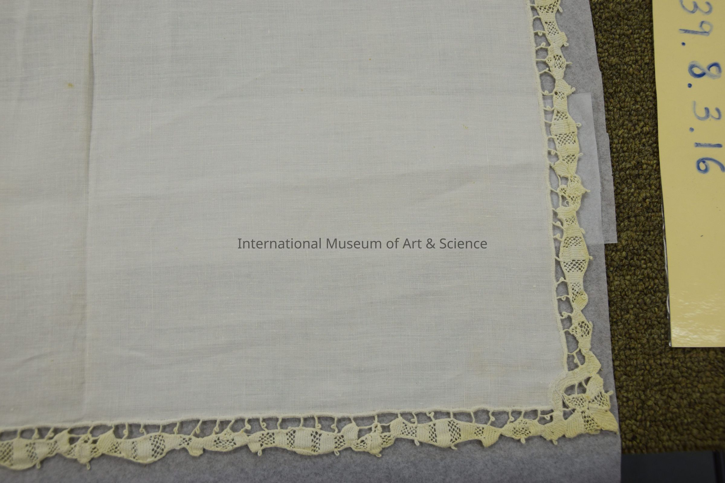 Napkin. Part of a set of 23 napkins with a matching tablecloth. It is a square, white linen napkin with an embroidery design on one corner, and a handmade lace tape edging all around. The most decorated corner has a lace insertion design that cuts into the white linen corner, and a cutwork embroidery done in a faint light blue thread. This cutwork design has scrolling and 2 flowers. The hand-made edging has buttonhole stitching, and is floral & scalloped to match tablecloth.