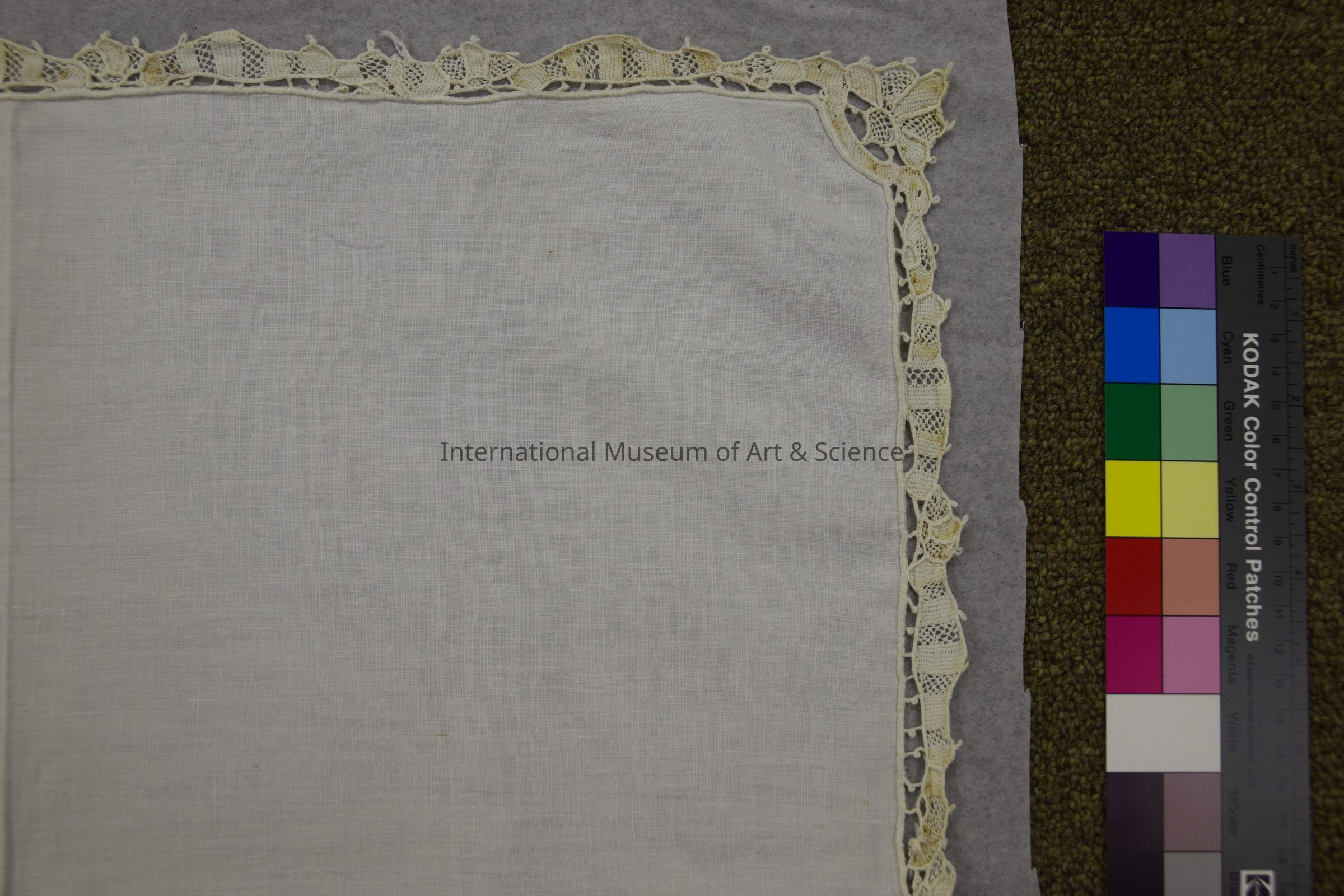 Napkin. Part of a set of 23 napkins with a matching tablecloth. It is a square, white linen napkin with an embroidery design on one corner, and a handmade lace tape edging all around. The most decorated corner has a lace insertion design that cuts into the white linen corner, and a cutwork embroidery done in a faint light blue thread. This cutwork design has scrolling and 2 flowers. The hand-made edging has buttonhole stitching, and is floral & scalloped to match tablecloth.