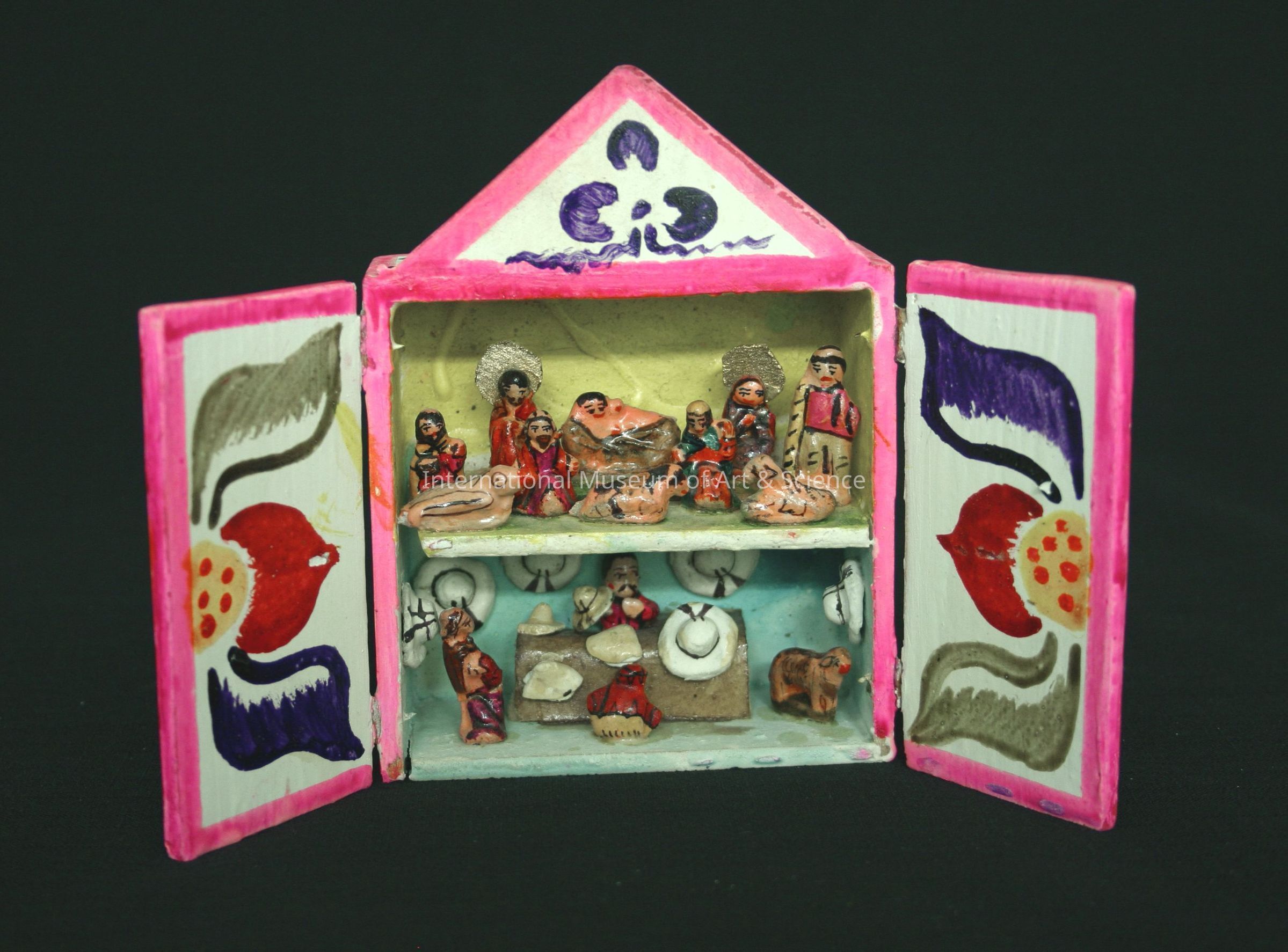 A two-story nativity retablo. The box is wooden and is painted white and pink with red flower on doors. the inside has two levels. The top floor has a yellow background and nativity scene. The bottom floor has a light blue background depicting sombrero shop. The figures are papier-mache.Artwork Details