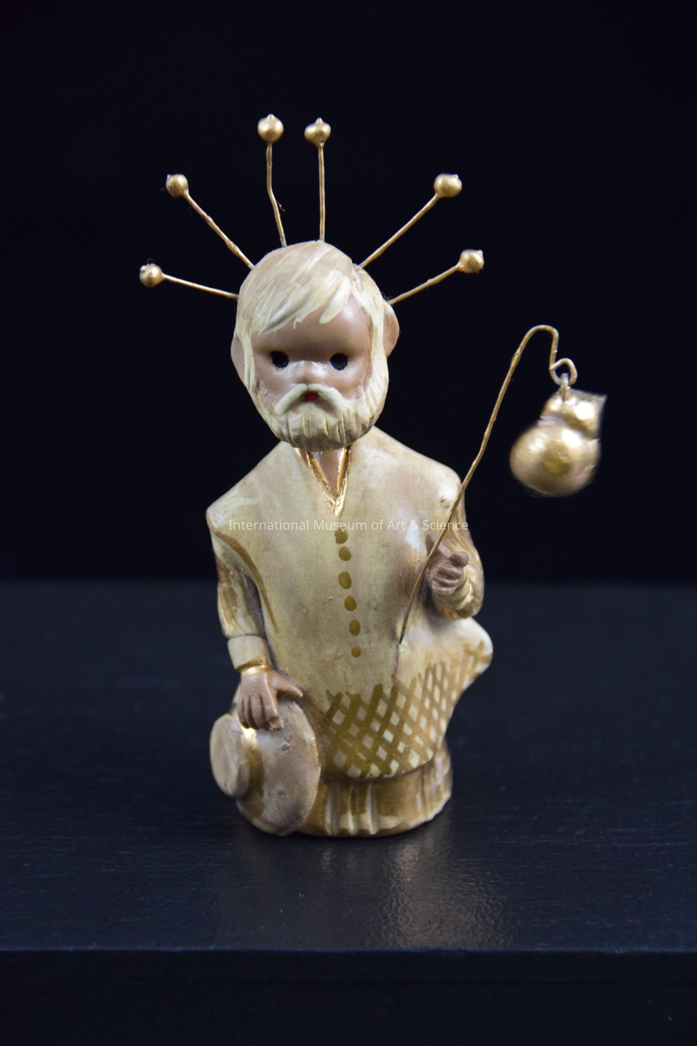 A clay figurine of Joseph with six projected attachments of gold; holding gold staff with water jug with left hand and hat on right hand. He is part of a Nativity Scene.Artwork Details