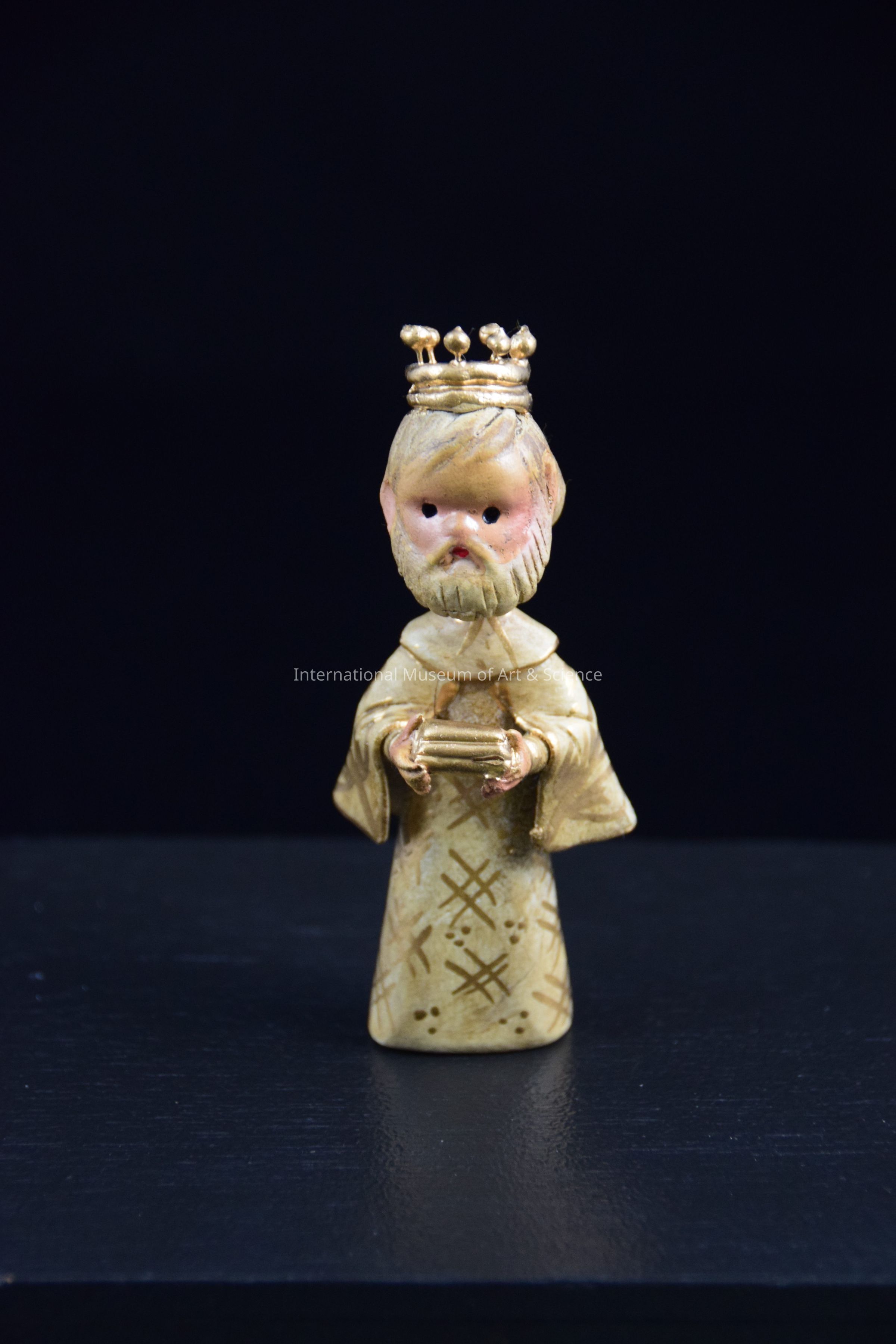 A clay figurine of a King holding gold case and wearing gold crown, cape, and robe. He is part of a Nativity Scene.Artwork Details