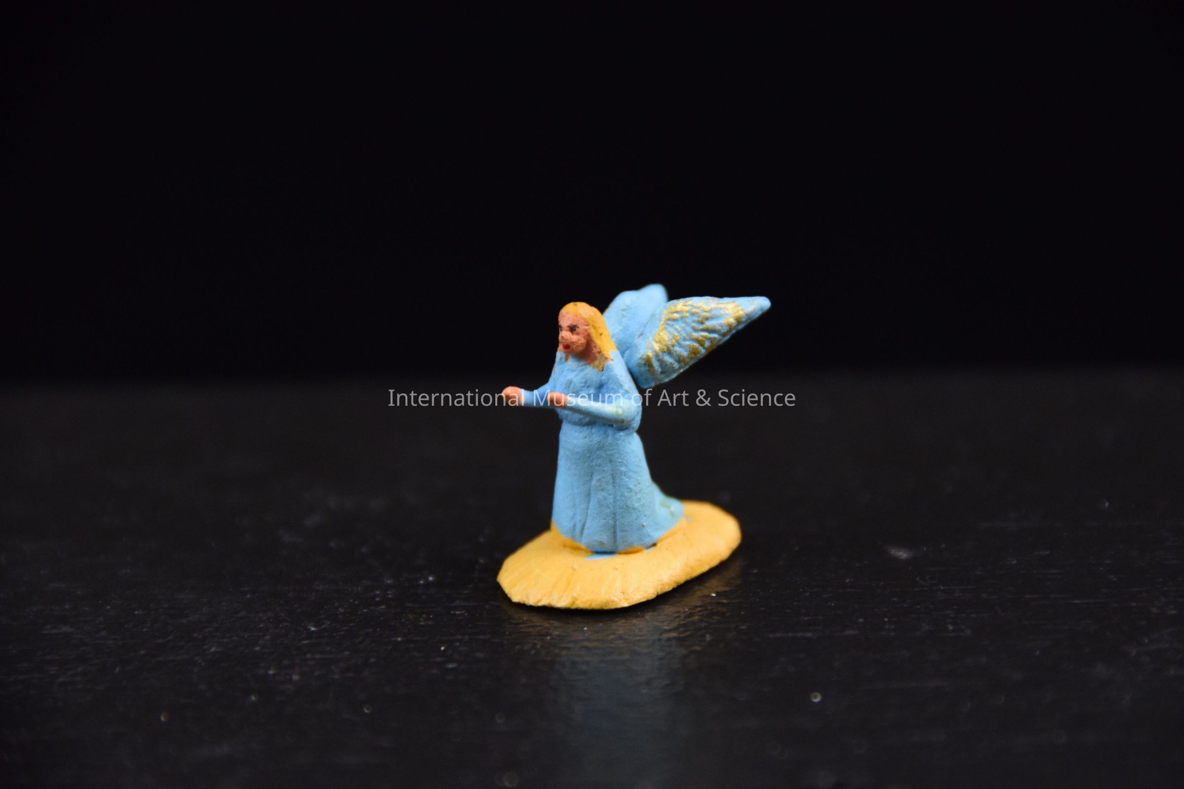 A very small ceramic figurine of an Angel. It is wearing a light blue robe and has light blue and gold wings. It is holding its hand out in front. It is kneeling on a yellow base. It is part of a miniature Nativity scene.Dimensions