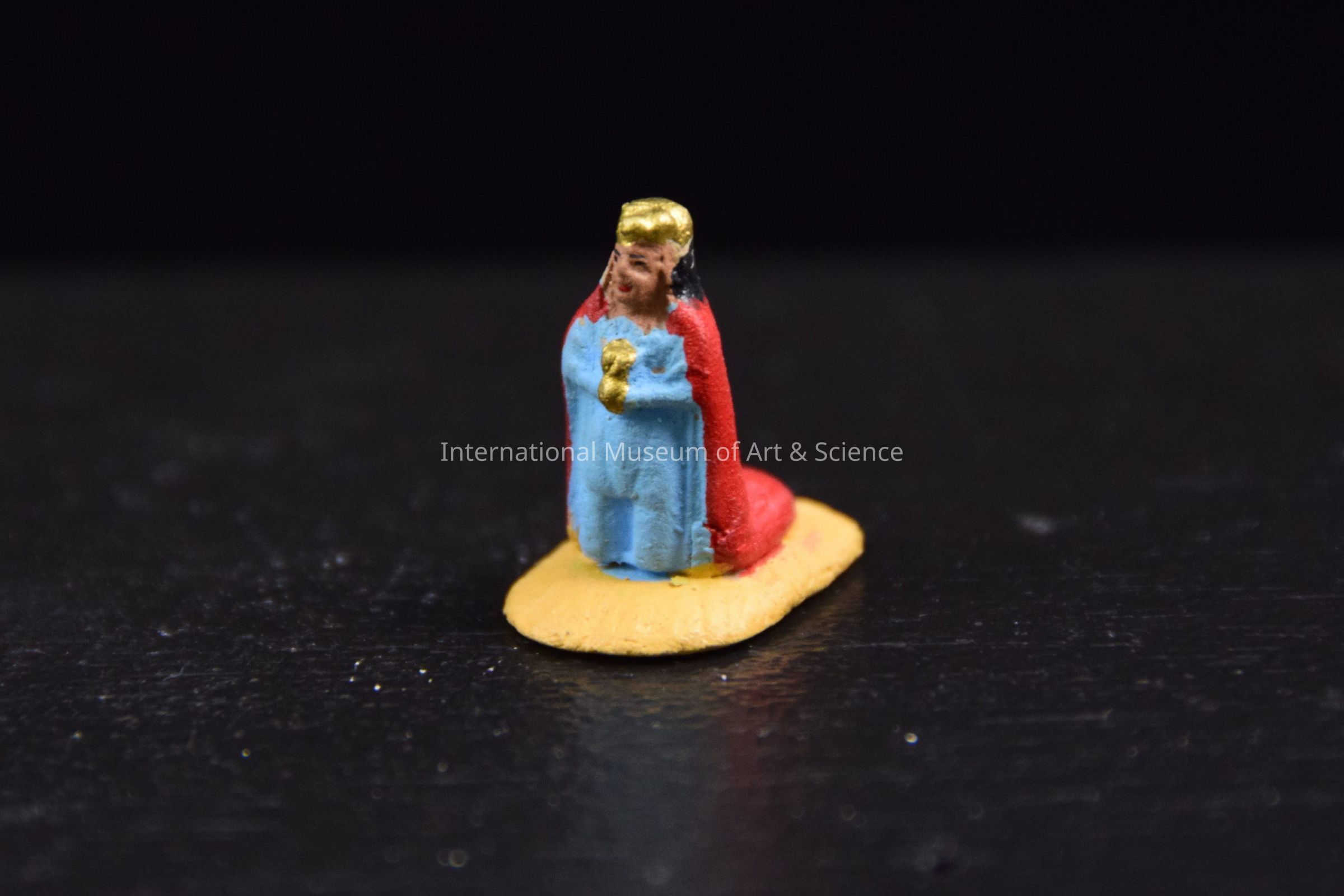A very small ceramic figurine of a Wise Man/Magi. He is wearing a blue robe, a red cape, and a gold crown. He holds a gold gift in his hands. He is kneeling on a yellow base. He is part of a miniature Nativity scene.Dimensions