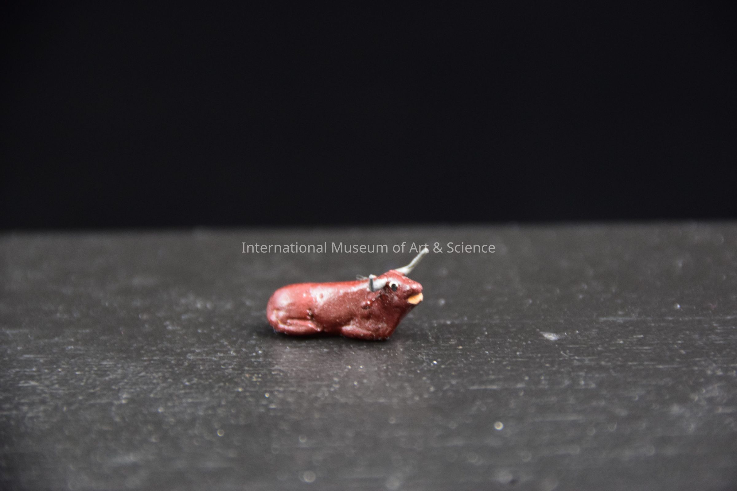 A very small ceramic figurine of a bull. It is a brown bull with grey horns. It is part of a miniature Nativity scene.Dimensions
