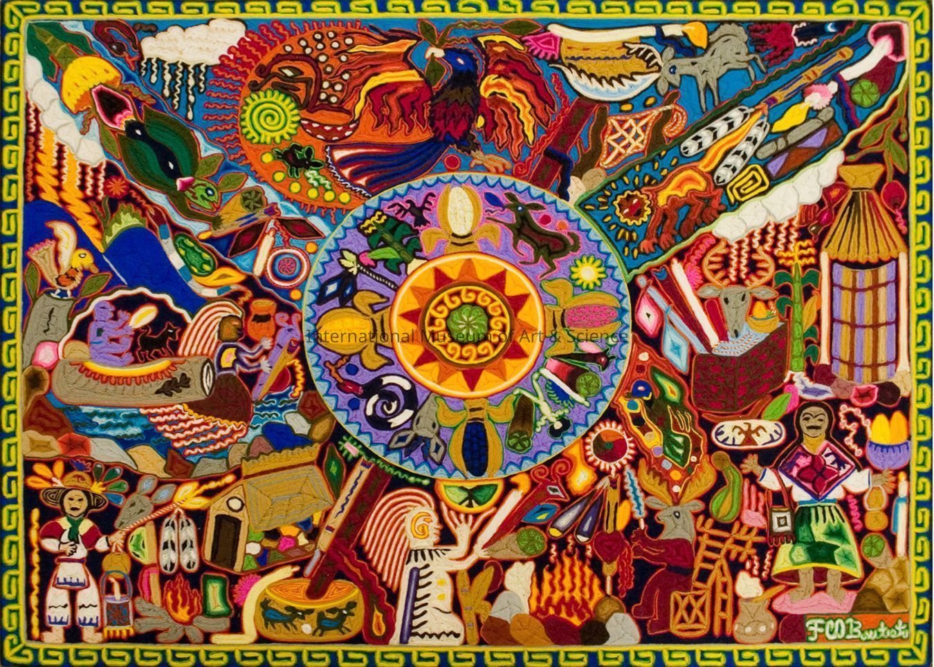 A yarn painting. The piece is very detailed showing different myths, histories, and stories relating to the Huichol people. The piece is filled with imagery of people, animals, and other symbols.Artwork Details
