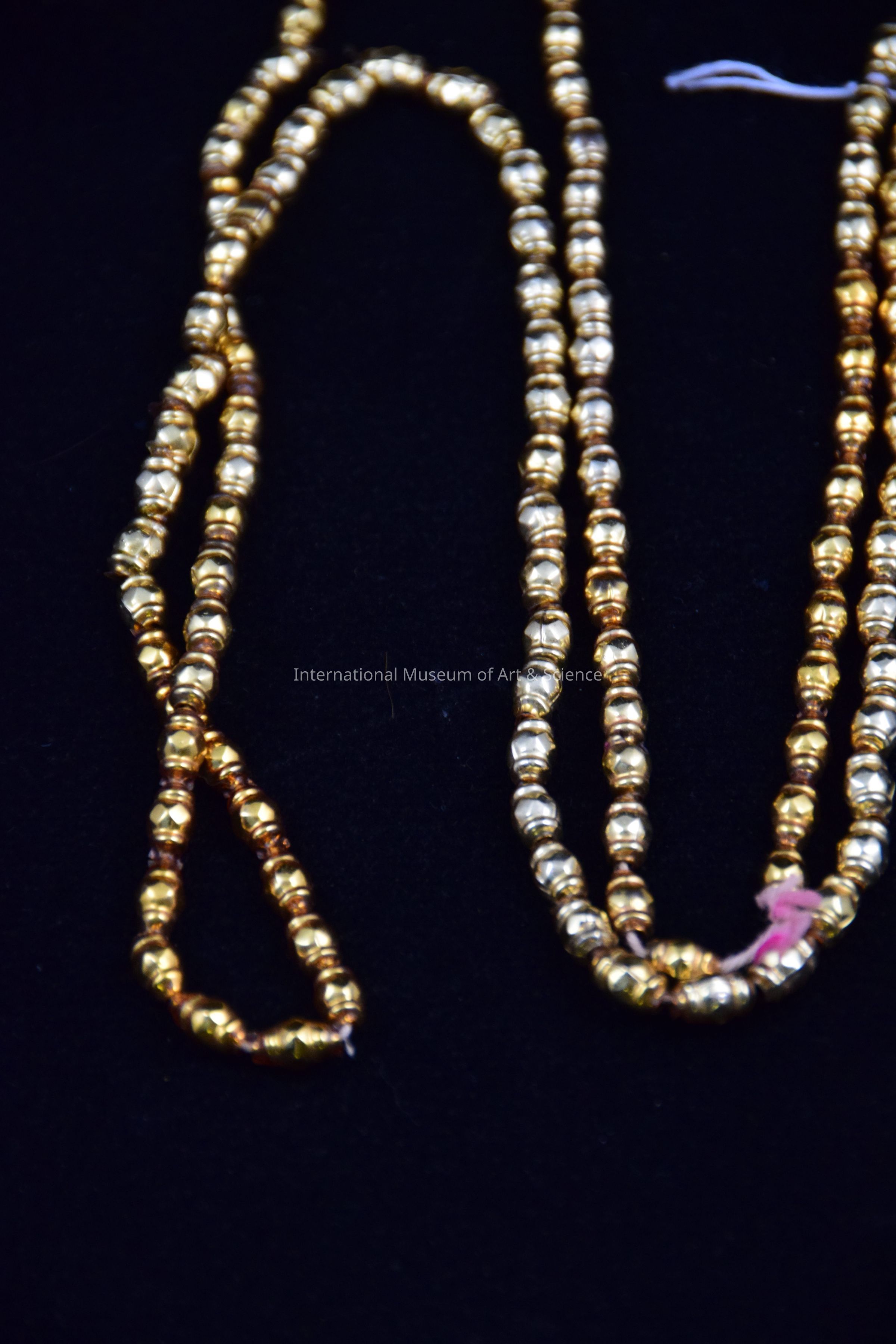 A necklace made up of a strand of gold, oblong "papelillo" (paperlike) glass beads.
