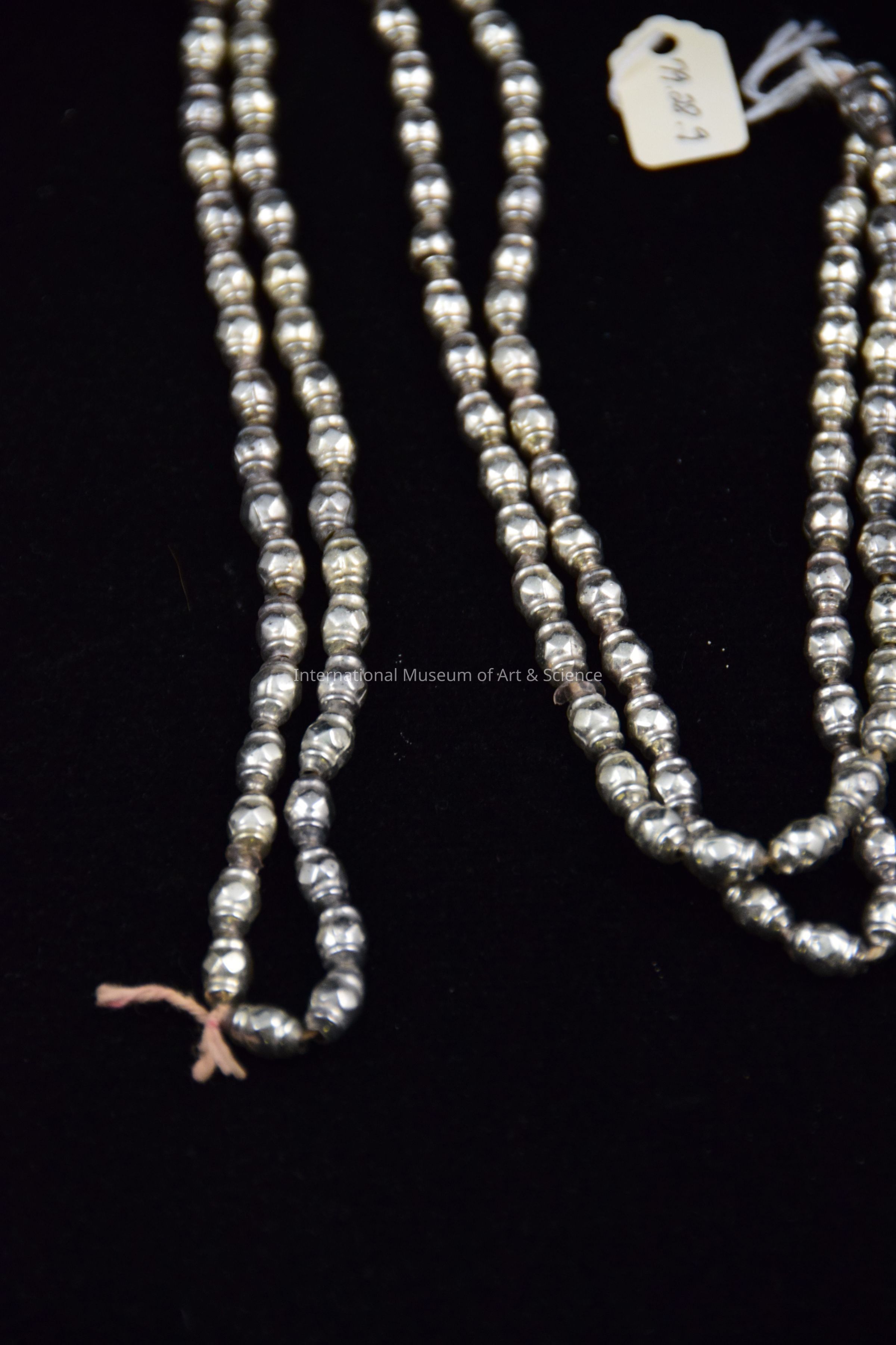 A necklace made up of a strand of silver, oblong "papelillo" (paperlike) glass beads.