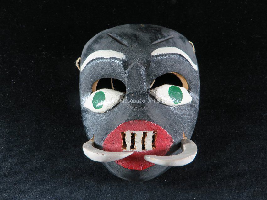 "Negrito colmilludo mask". Black wooden mask with white painted eyebrows, white wooden tusks attached; red oval carved mouth with white teeth; short nose; vicious oval eyes painted white with green; carved eye openings; two linear indentations on forehead.Dimensions