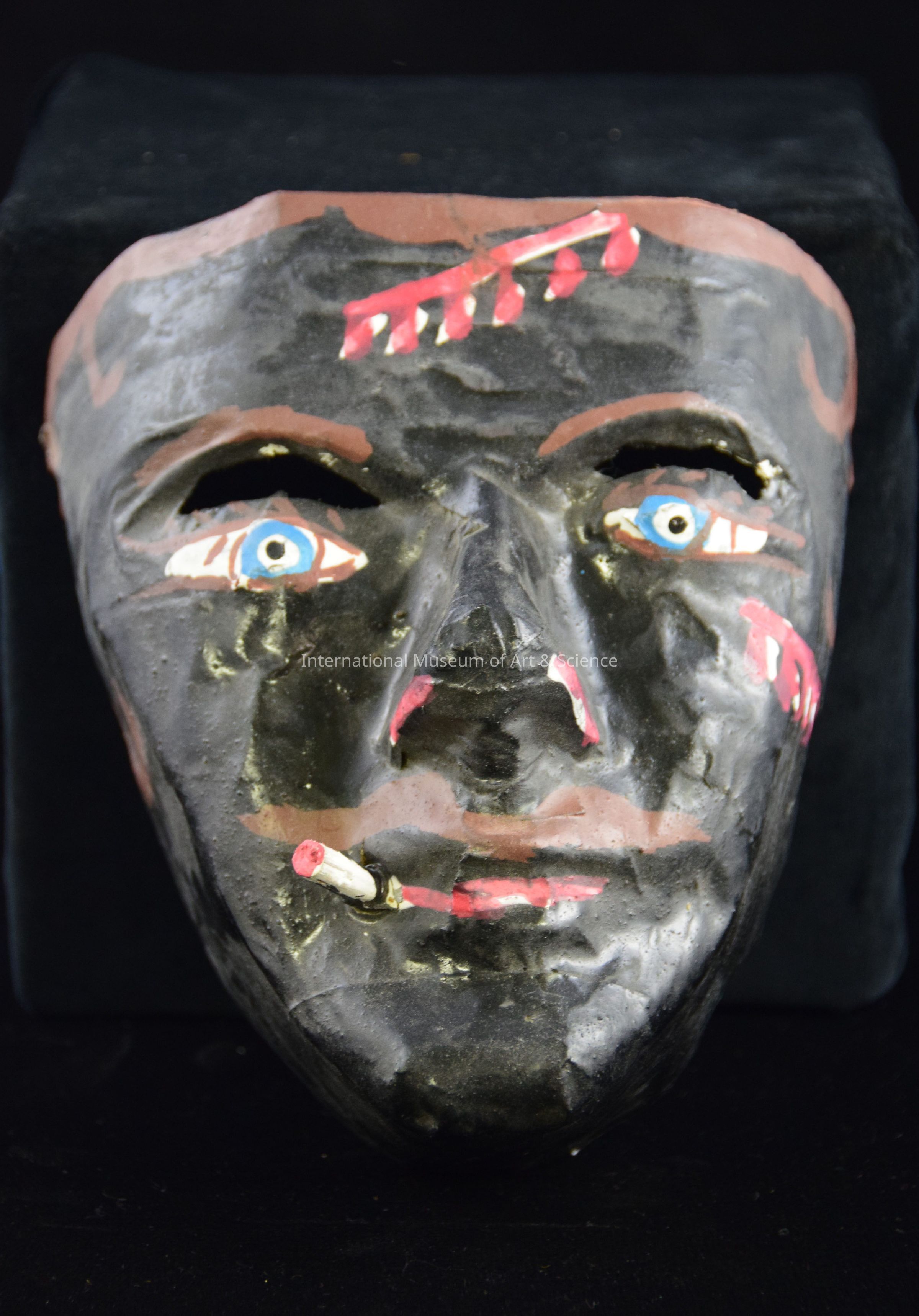 A papier-mache mask. The mask depicts a man's face. The face is painted black with blue eyes, and brown curled hair, eyebrows, and a moustache. There is a cigarette protruding from the mask's lips.Artwork Details