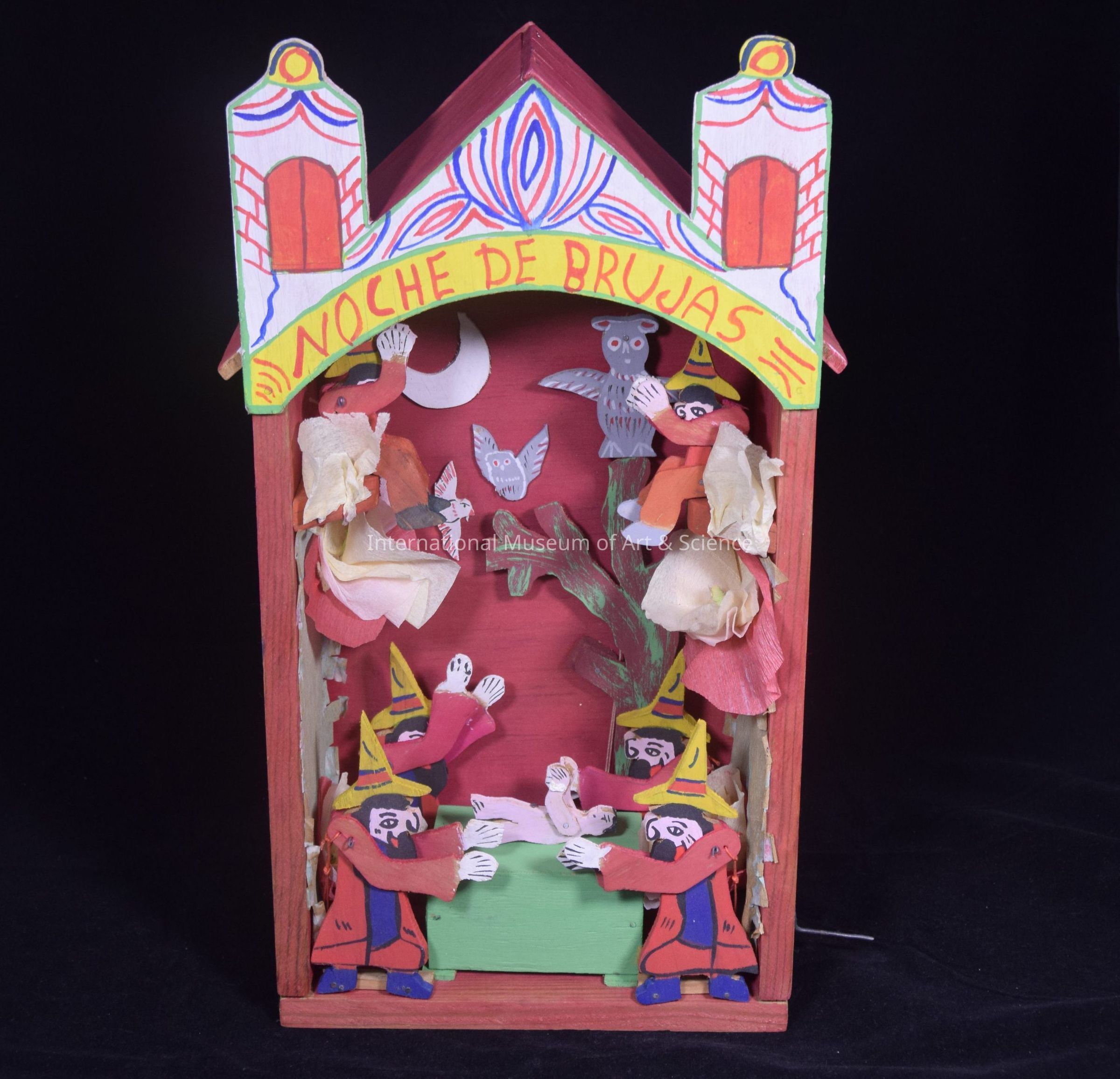 A folk toy. The scene in the box shoes an infant on an altar with people surrounded the altar in and in the trees. There are trees and animals in the background. It has a metal crank that moves arms and the owl's wings.Artwork Details