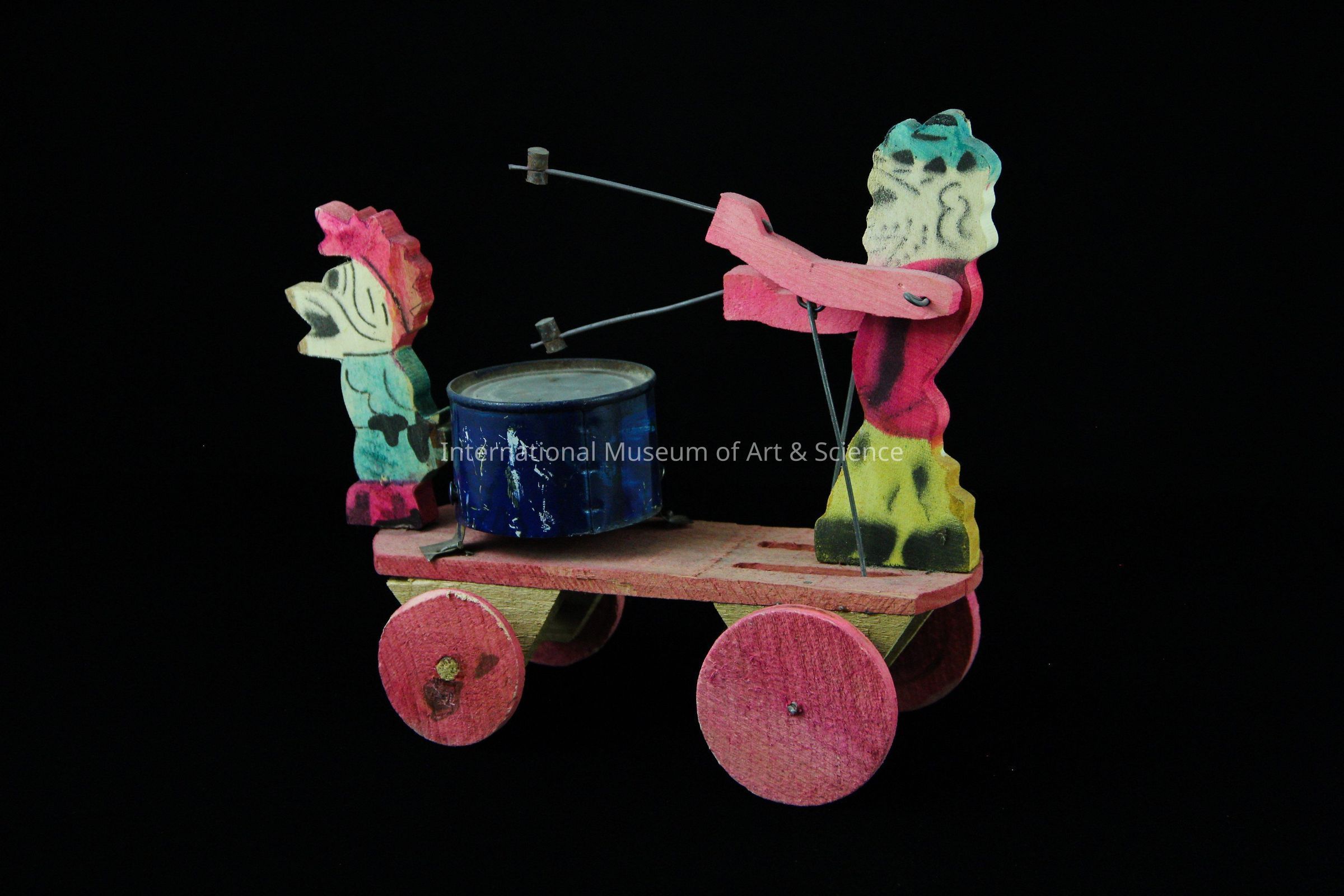 A wooden pull toy that is also a noisemaker. The toy is carved from wood. It shows a man standing on a cart with drum sticks in each hand. As the cart rolls, his arms move up and down to make noise against the tin can drum attached in front.Artwork Details