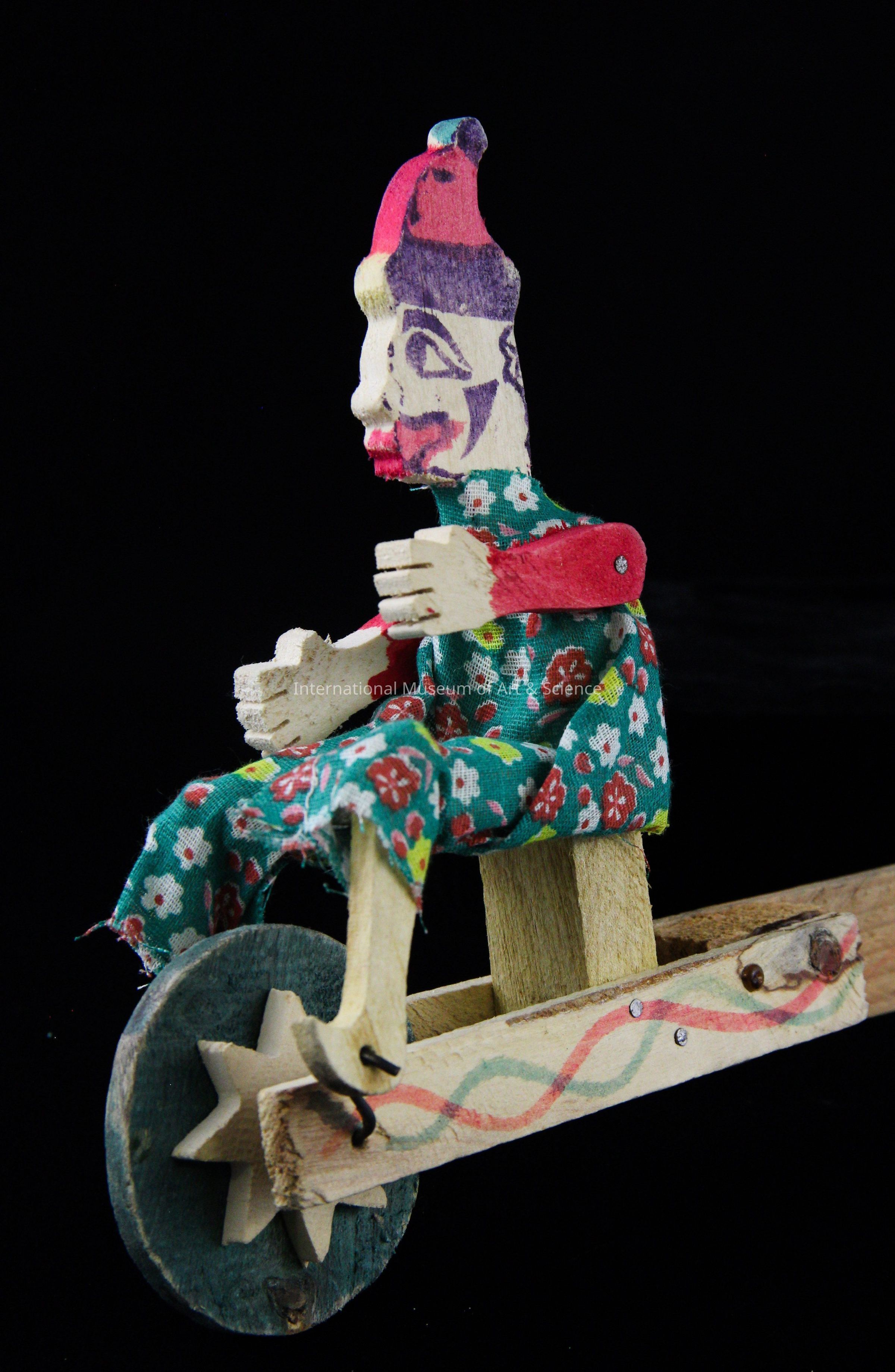 A toy noisemaker. The noisemaker is a wooden painted clown pedaling green painted wheel. The whirling gadget with a toothed wheel chatters against the edge of a thin piece of metal to produce the sound. The handles are painted with red and green curved design. The clown is wearing green overall outfit with red, yellow, and white flowers.Artwork Details