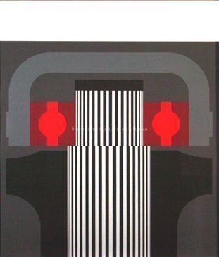 "November". Black and gray vertical stripes at center; dark gray background; left gray arched form at the top section followed by light and dark red circles and blocks; Black vertical L-forms lover right and left. Hard-edge design resembles industiral form.Dimensions