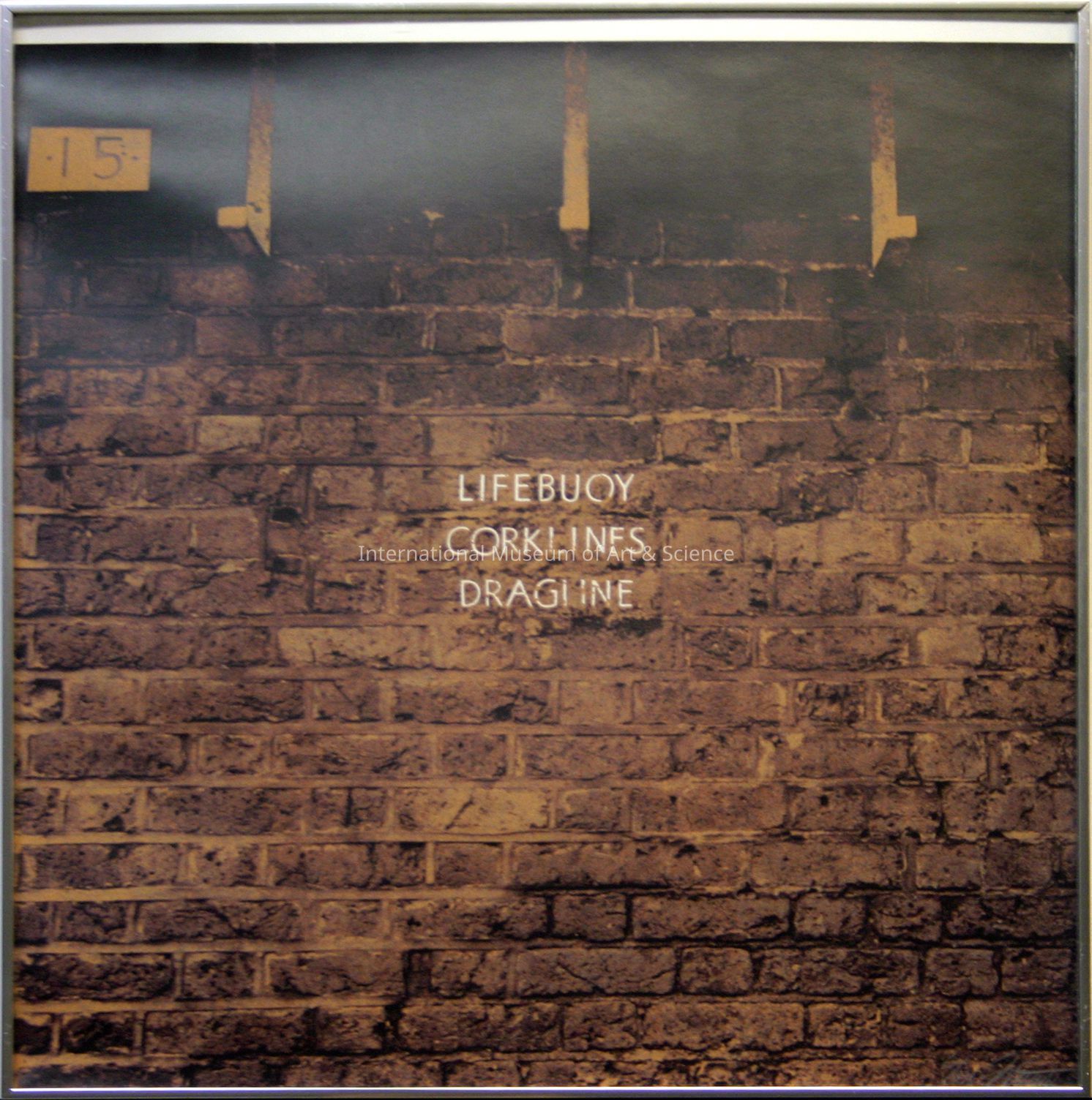 "November". Gerd Winner, German. Silkscreen. 1973. Printed in Stuttgart, West Germany.Overall picture of a brick wall, clay reddish-brown; white lettering "LIFEBUOY CORKLINES DRAGLINE"; upper left there is a number 15; three steel bars vertically separated above the brick wall; top section pitch black. Overall fine half-tone dot pattern.Artwork Details