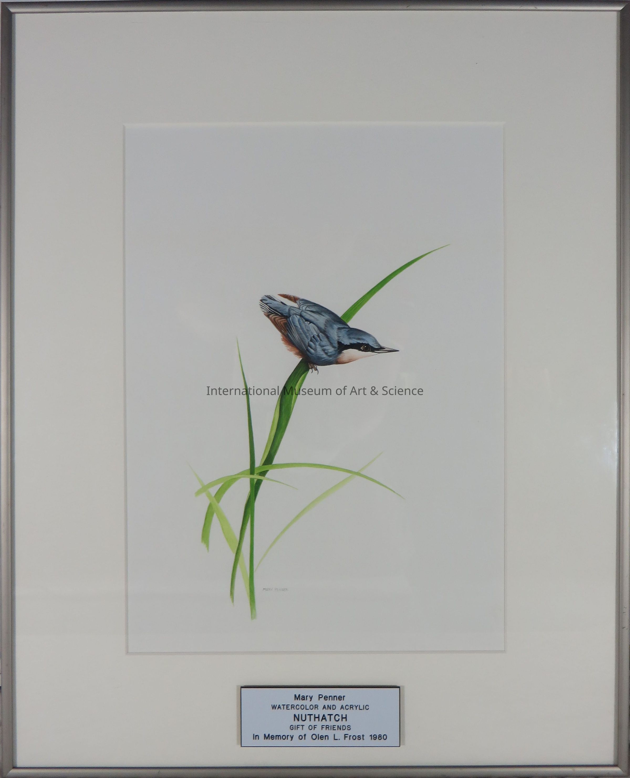 A watercolor and acrylic painting on paper. A Nuthatch bird sits on a long strig of grass.
