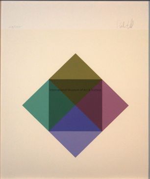 "October". Cream background; diamond shape, upright triangles of the diamond in different colors; top upright triangle is beige; left triangle is light green; right triangle is light lilac; bottom upside down triangle is bright lavender; center of diamond shape is a square featuring the darker shades of the triangles top is dark khaki green, left is medium cool green right is dark lilac, and the bottom is dark lavender.Dimensions