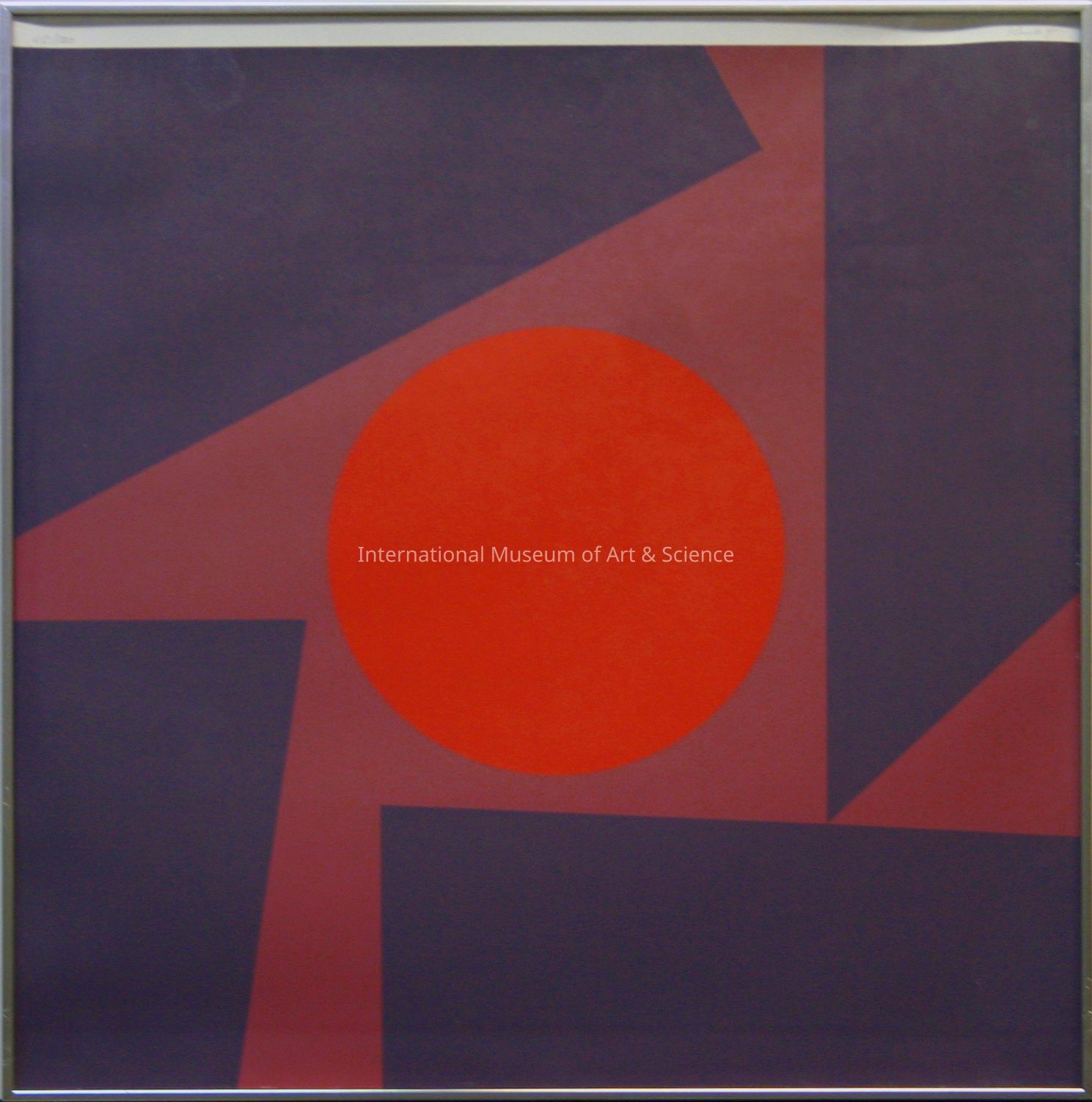 "October". Fritz Ruoff, German. Silkscreen. 1973. Printed in Stuttgart, West Germany. Central spherical shape of red-orange; purple background; irregular shapes of deep wine color surround sphere at center, radiate to edges of composition.