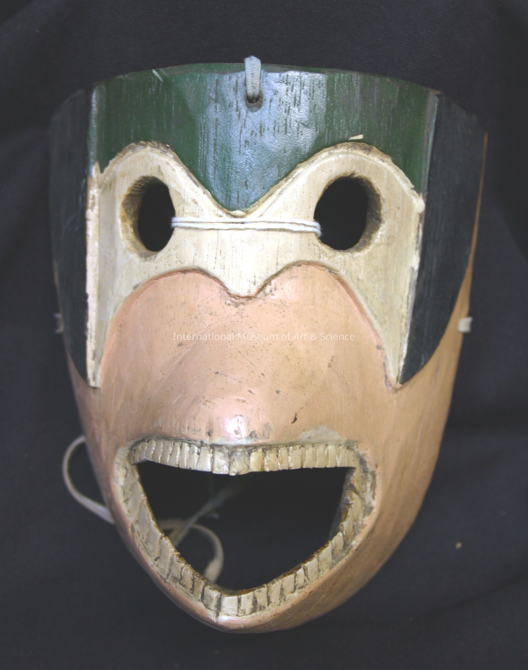Old dog mask. Dog face mask of peach flesh clor; green forehead; black carved ears; cream eyes; open protruded mouth with small, even carved teeth.Artwork Details