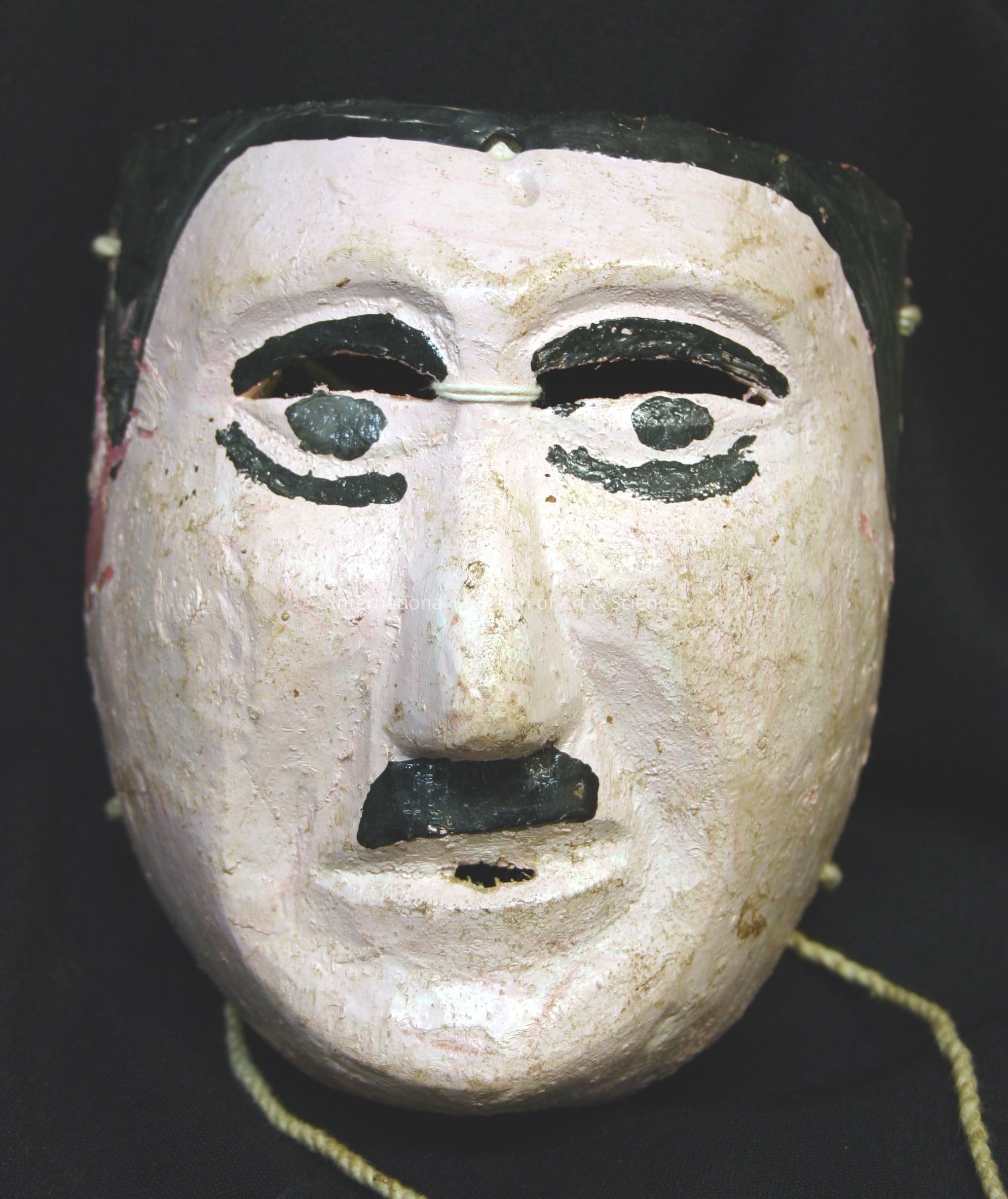 Old man mask. Overall pale pink face mask; dark pink primer exposed; black facial features and moustache; white cotton cord attached.Artwork Details