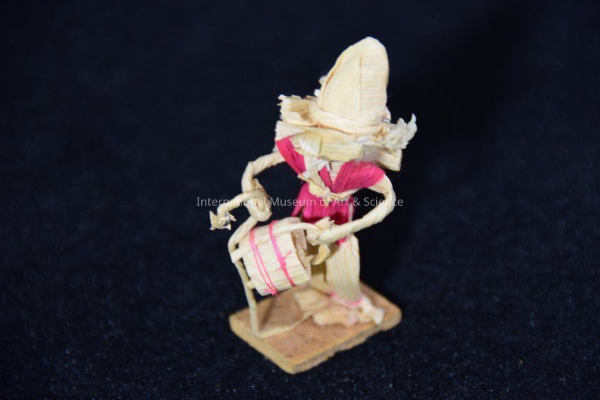 Figure of old man. Made of corn husks, carries bundle on back, bucket in left hand and cane in right. Cotton for hair, large hat on head. Bright pink shirt, pink threat trim bucket and ankles of figure. Attached to rectangle composition board.Artwork Details
