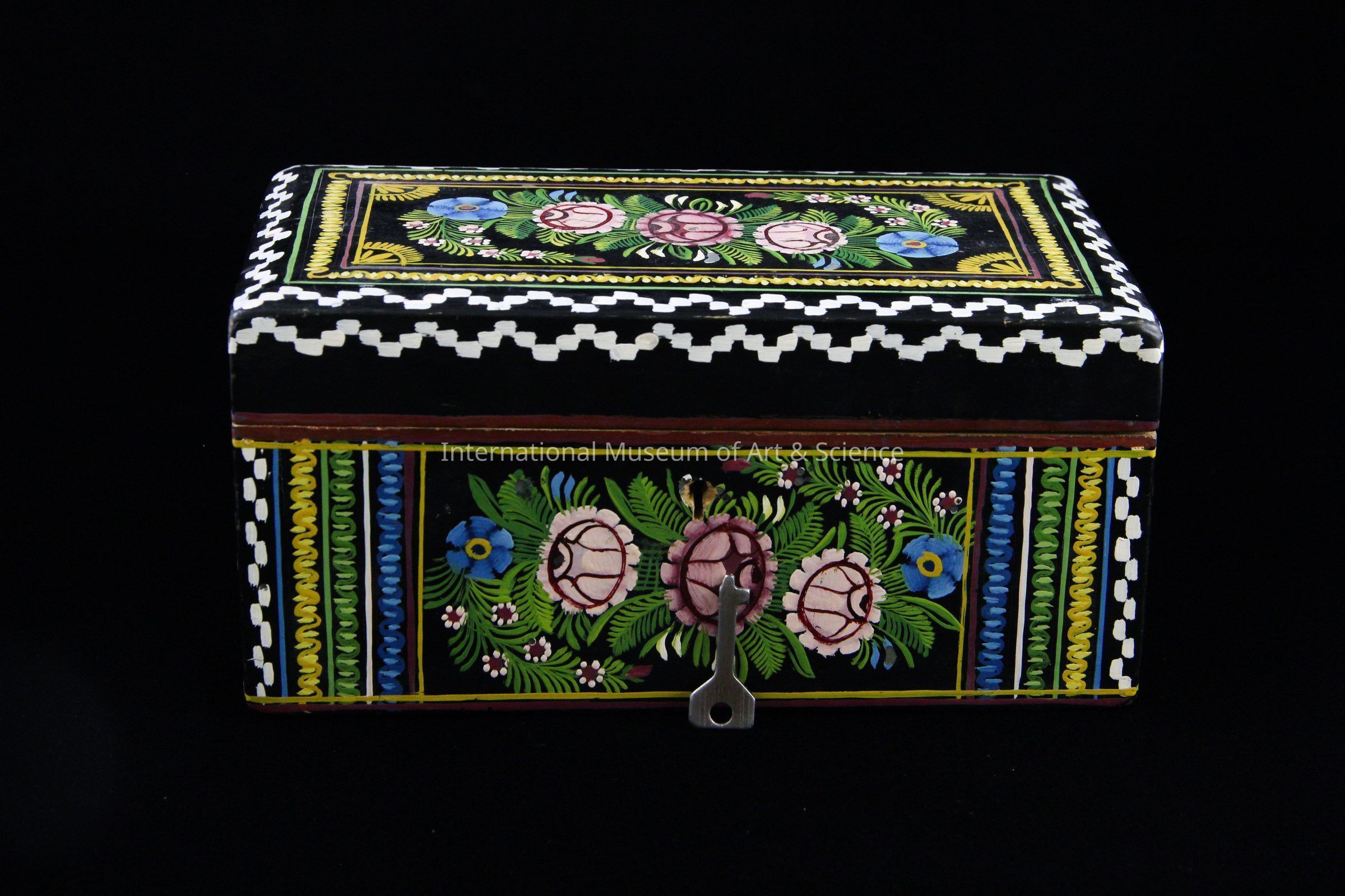 A wooden Olinala box. The box is rectangular and decorated with floral and geometric designs. There is a lock on the box with its original key.Artwork Details