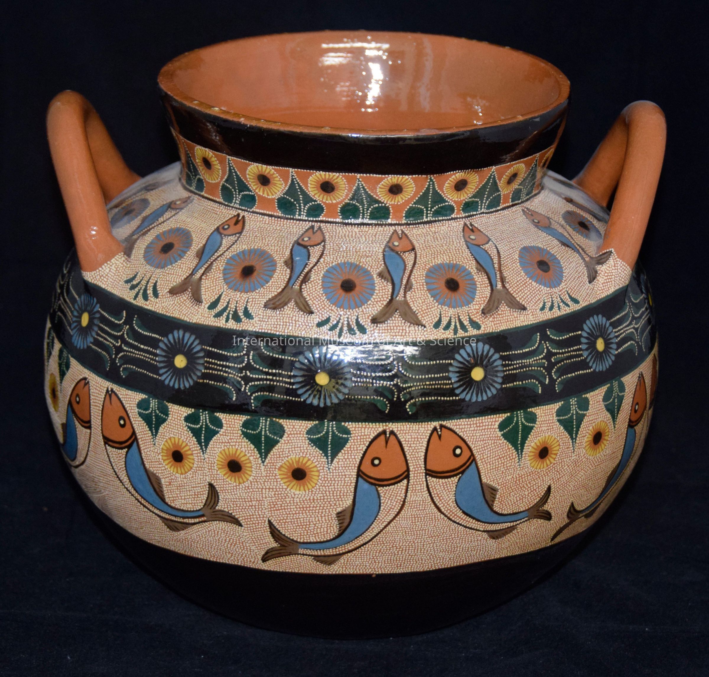 Pot with lid. Large round pot, two large loop handles, plain orange; lid with two-headed snake handle; four small, two large blue-orange fishes.Ethnography