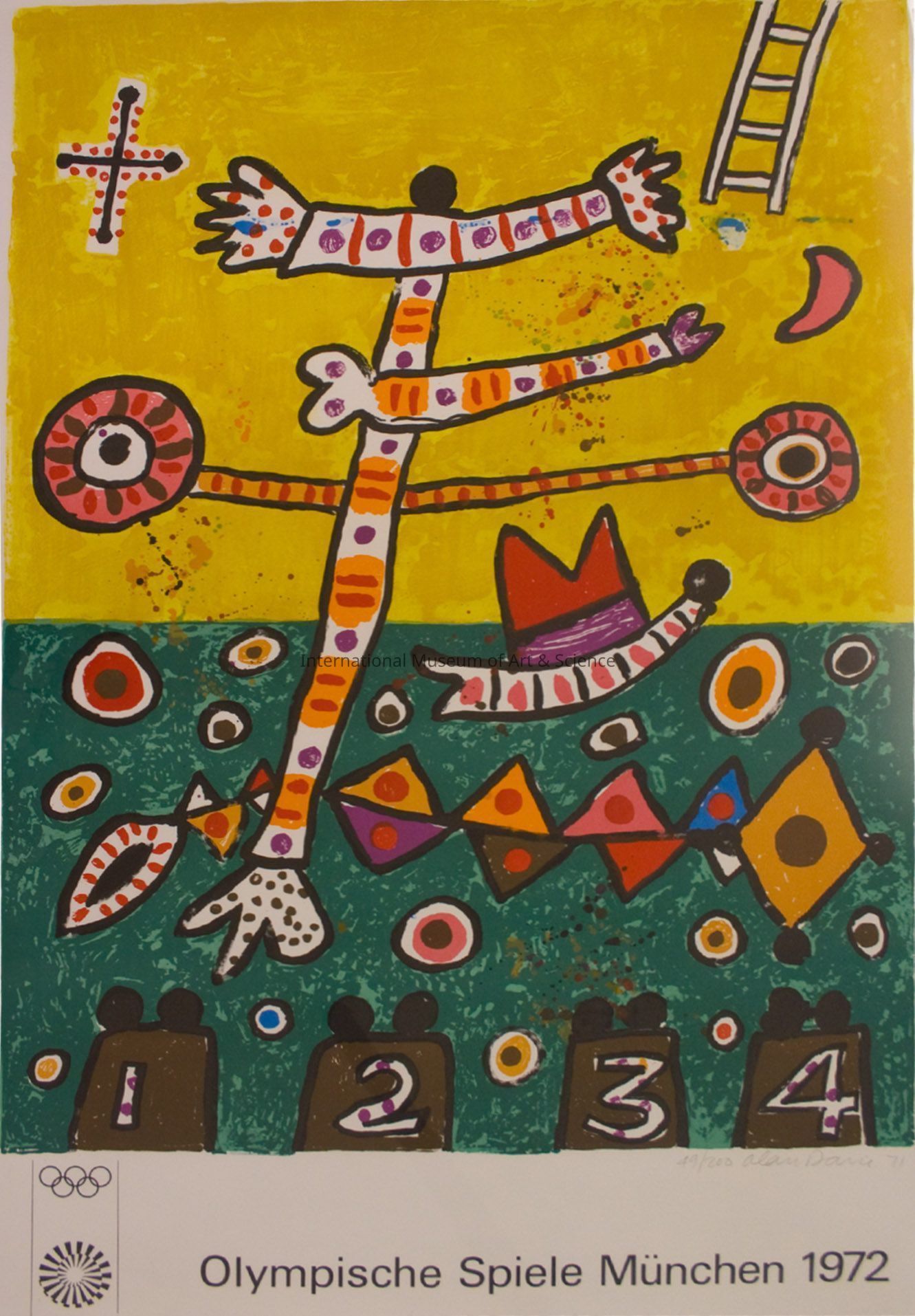 "Olympische Spiele Munchen 1972". Alan Davie, American. Print. Date Unknow. Background of yellow in upper part and green in lower part; upper area contains a black cross surrounded by red dots, also a black and white ladder, red with black outlined moon, two wheels in pink and brown with black outline on orange band with red stripes which is also outlined in black; lower green area has multi-colored circle and diamond forms with black outline; seats with figures and numbers one through four are on lower; bands of various colors on upper and lower borders; "Olympische Spiele Munchen 1972" printed below. Signed; 49/200.Dimensions