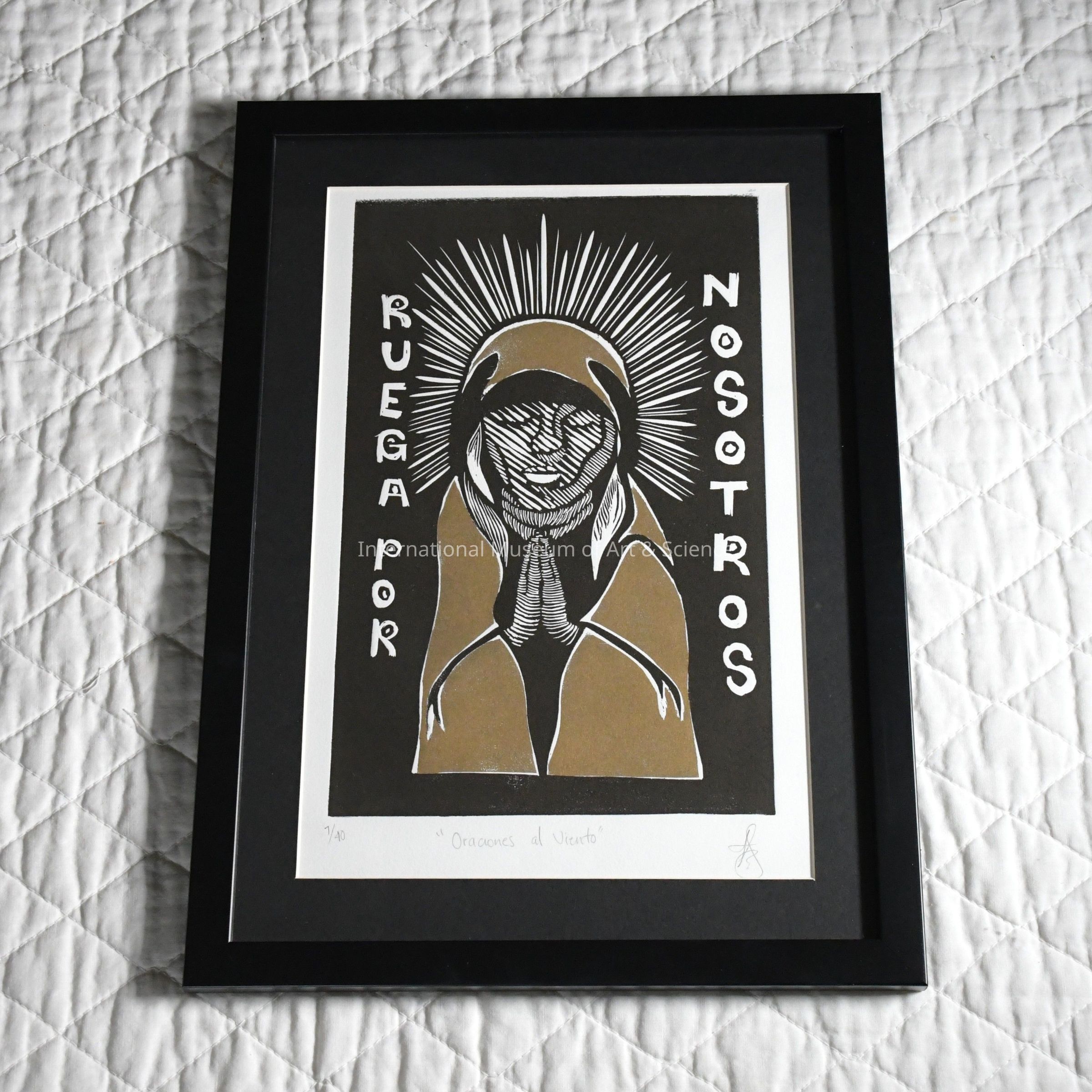 A linoleum block print on papel Canson, 320 grams. 39 x 28 centimeters. This framed block print image depicts a hooded individual with both hands clasped in prayer while looking down. Light beam details encircle the top of the individual's head, giving an ethereal presence to the action. An inscription on either side of the subject reads "Ruega por Nosotros", which translates to 'Pray for us'.Made/Created