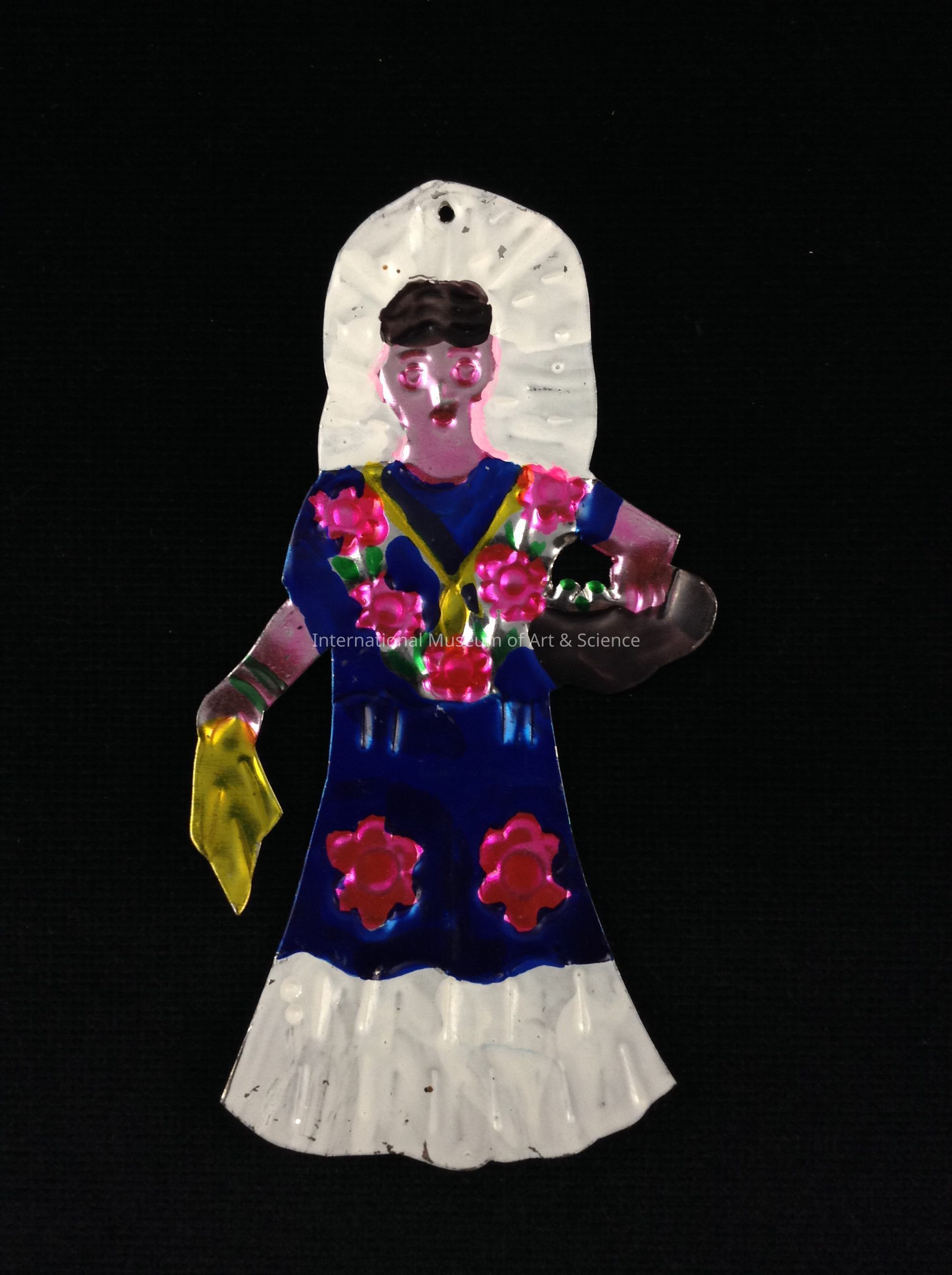 A tin stamped ornament in the shape of a woman in traditional dress. This ornament is of a Tehuana woman, Isthmus of Tehuantepec, she is wearing a white headdress and skirt, with a blue dress decorated with pink floral motifs.Artwork Details