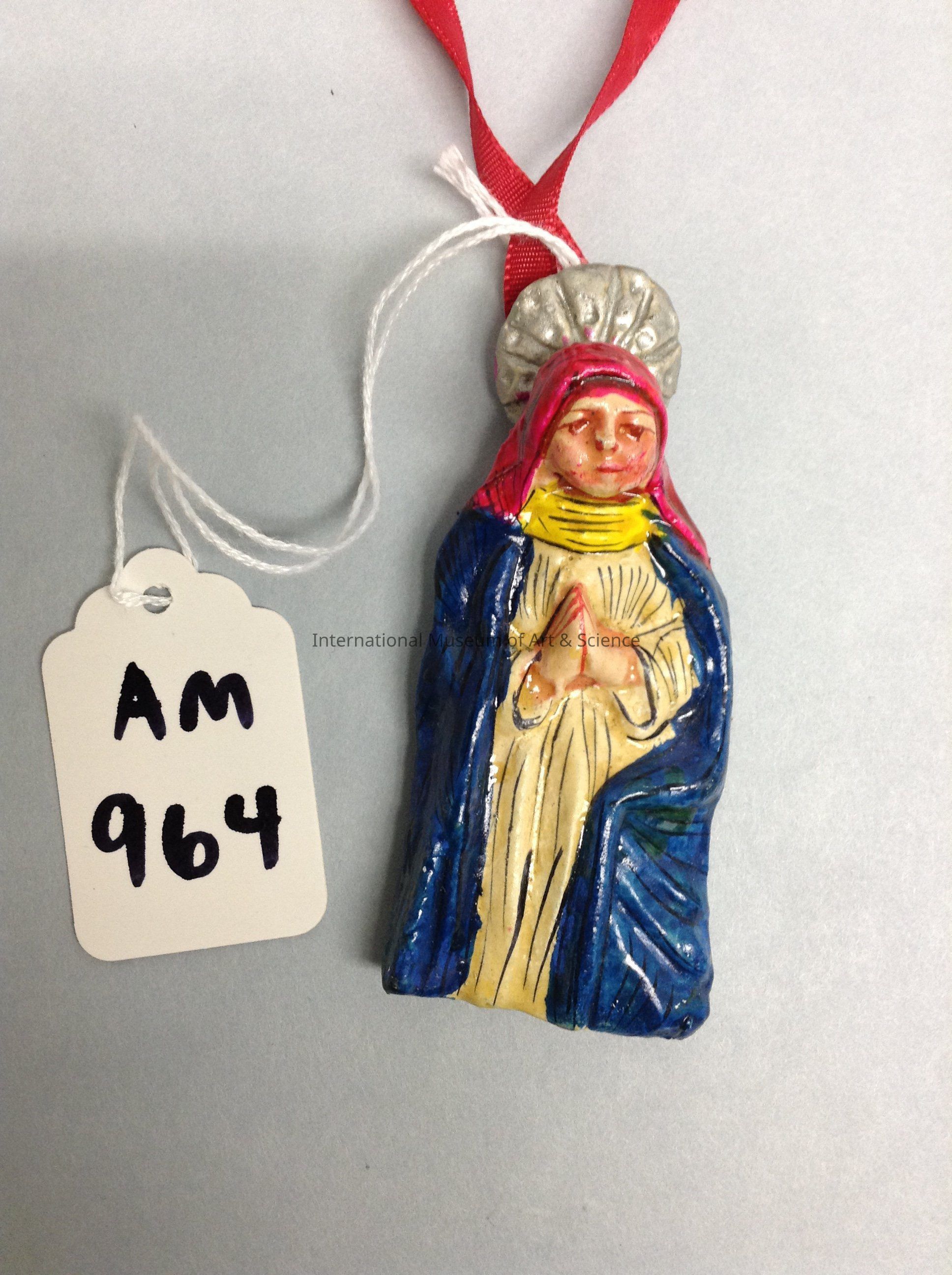 A clay figurine of the Virgin Mary in yellow and blue clothing. Has a silver halo attached to the back of head. Her hands are in the praying position. The hood of her clothing is a bright pink. There's a sticker on the back that reads, "Peru". There's a loop on the back of head with a red ribbon tied on. The figurine is tied to two other figurines, Joseph and Infant Jesus.Dimensions