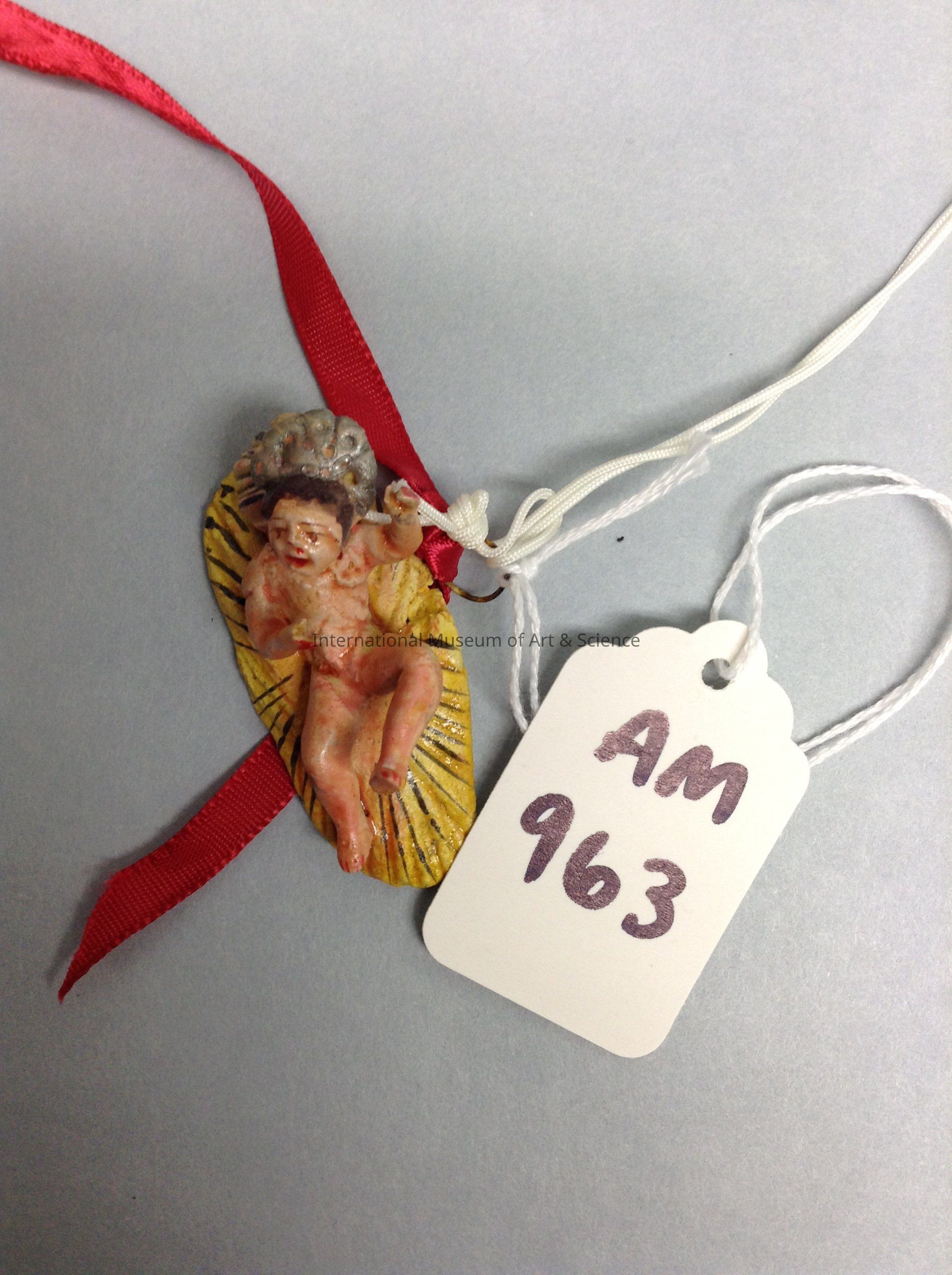 A clay figurine of Infant Jesus with a silver halo behind it's head. Is laid on top of what appears to be yellow hay. On the bottom there's a sticker that reads, "Peru". There's a loop that's attached to the side of the hay that has a red ribbon tied to it. The figurine is attached to two other figurines, Joseph and Mary.Artwork Details