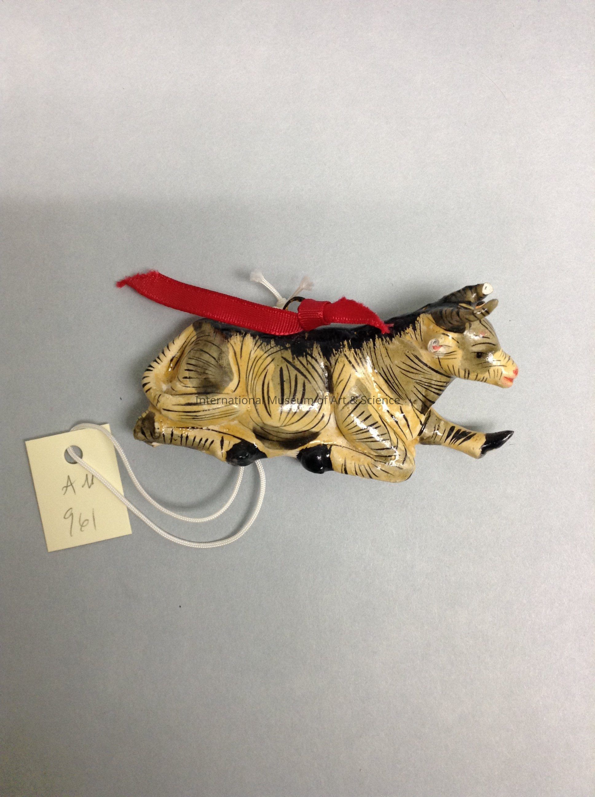 A miniature beige cow with washed out grey spots and a yellowish glaze. Details are done in fine black lines. On the back there's a sticker that reads, "Peru". On top of the cow there's a hook with a red ribbon attached.Artwork Details