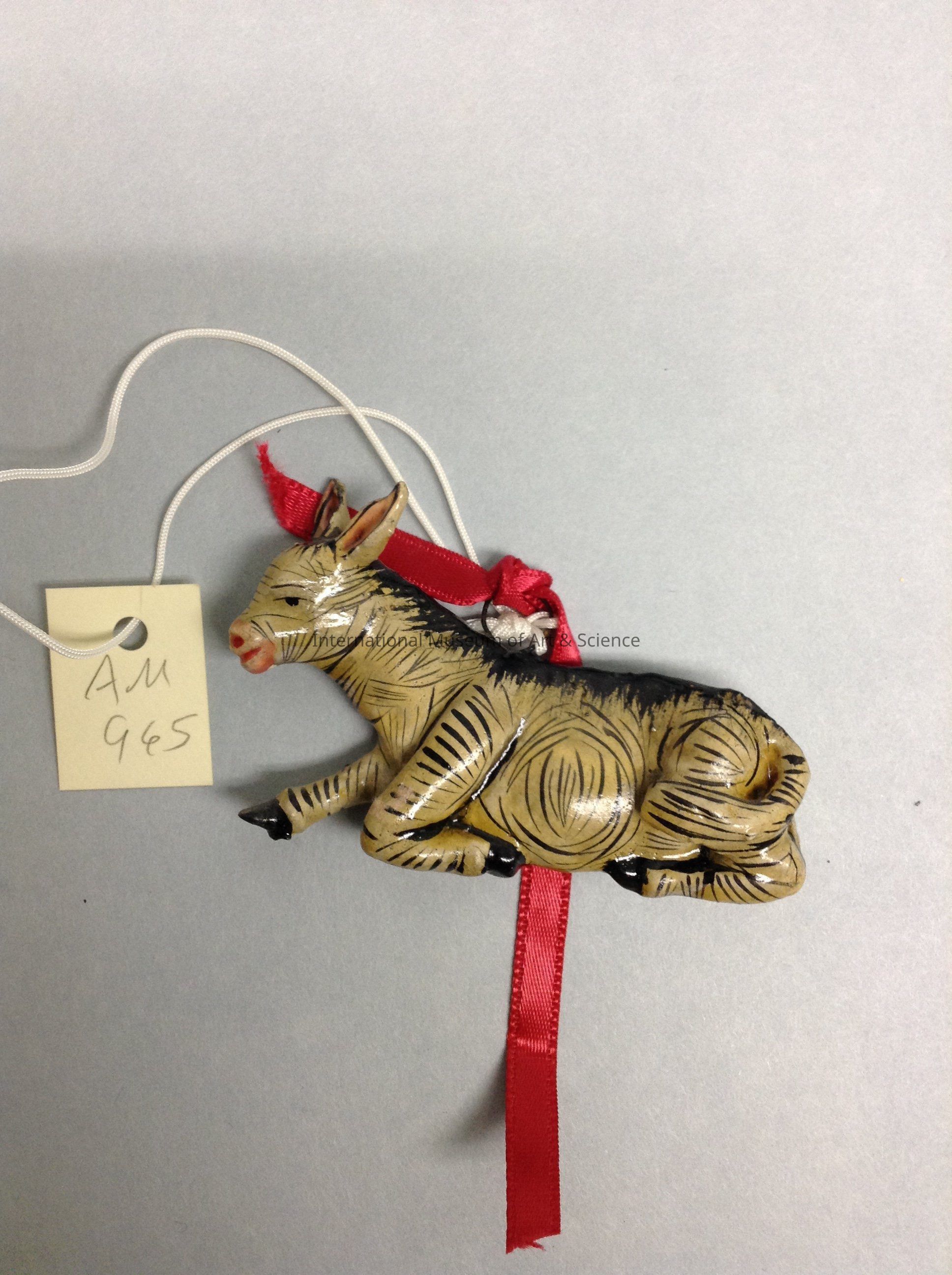 A miniature figurine of a beige donkey with a yellowish glaze. Details are done in fine black lines. There's a hook attached to the top of the donkey with a red ribbon tied on. On the back there's a sticker that reads, "Peru".Artwork Details