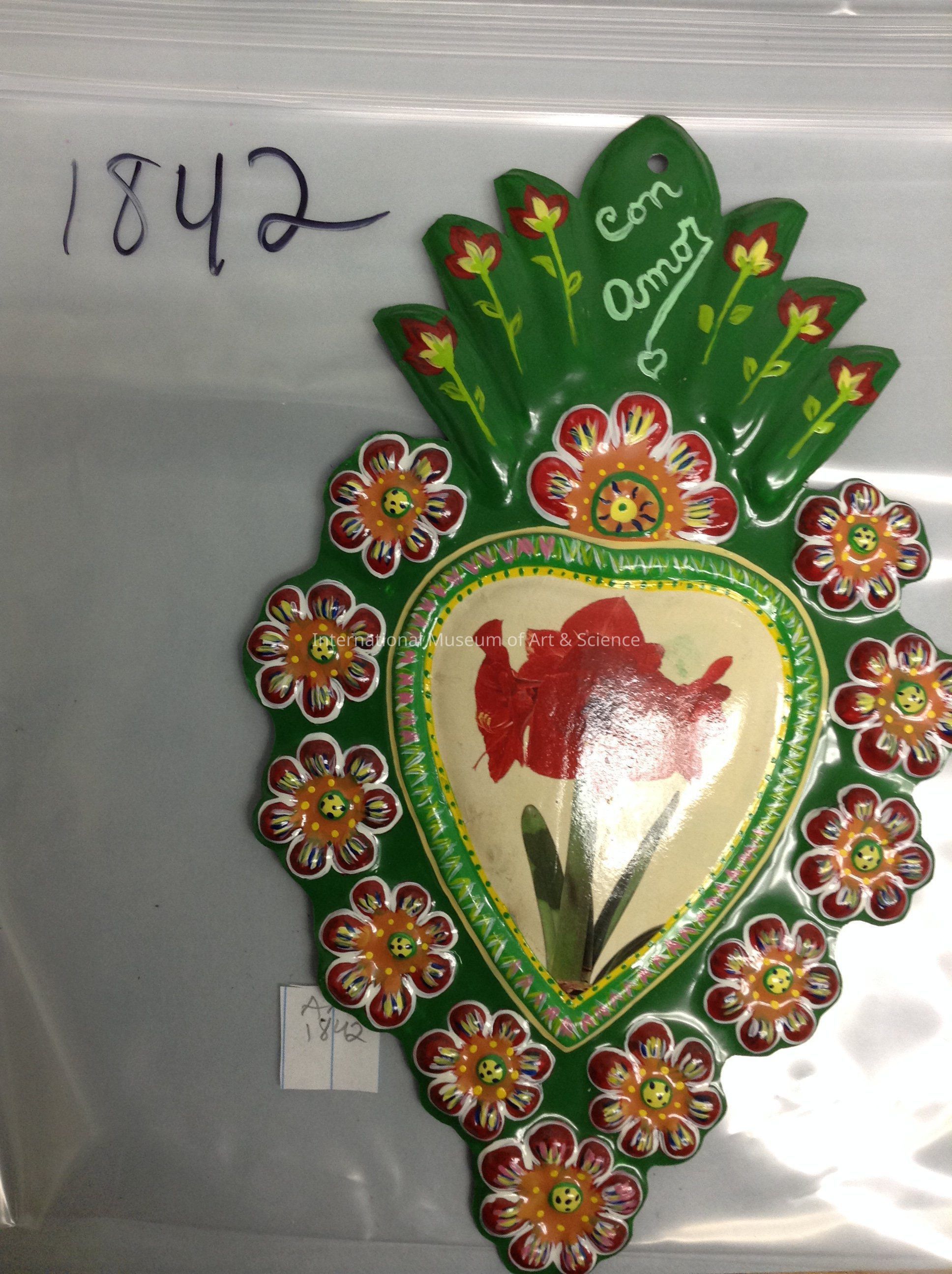 A tin light yellow heart with a photo of a flower glued onto the center. Surrounding the center are twelve flowers in red, orange, yellow and green. Above the heart are six more flowers that appear to be daisies. The six flowers are divided into two groups of three and in the center, "Con Amor", is written. Above the writting is a hole which allows for the object to be hung. On the back, "BG Peru", is written".Artwork Details