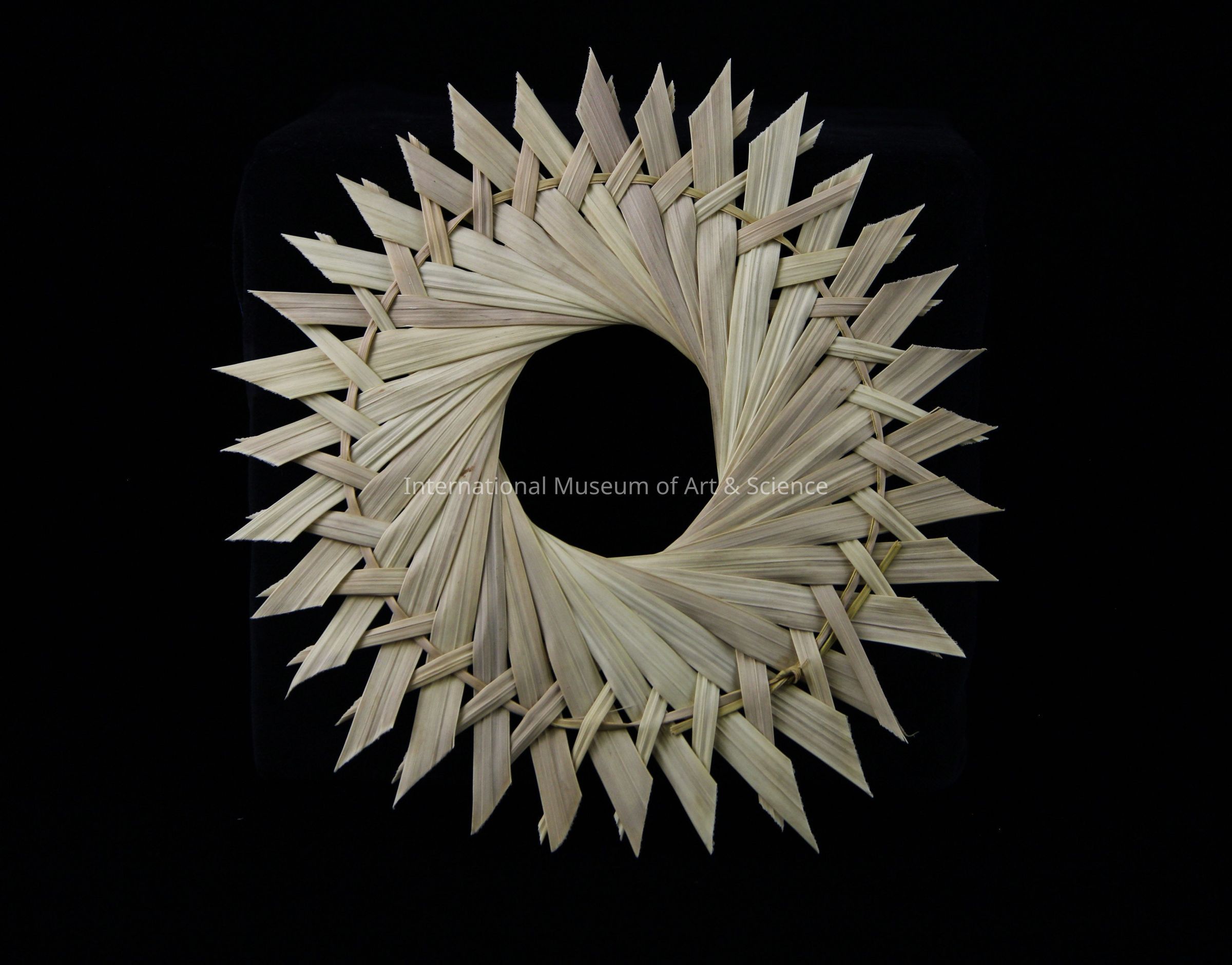 A wreath ornament woven from dried palm leaves. The circle of woven palm is trimmed with a natural colored string.