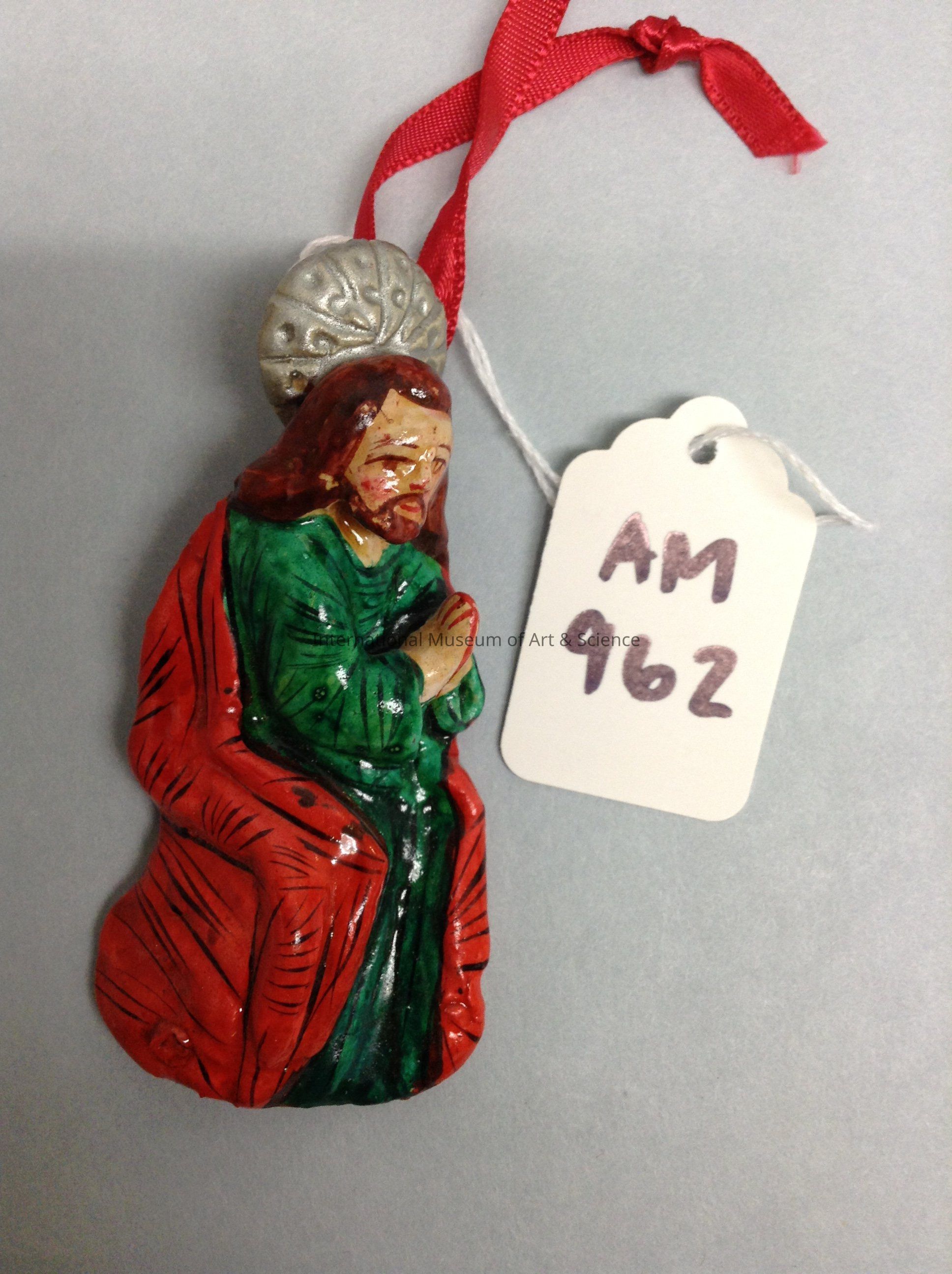 A clay figurine of Joseph wearing a green and red robe. His hands are in the praying position. Has a silver halo behind his head. Has fine line details in black on the red robe. On the back there's a sticker that reads, "Peru". There's a loop behind the halo with a red ribbon attached. It's attached to two other figurines, Mary and Infant Jesus.Artwork Details