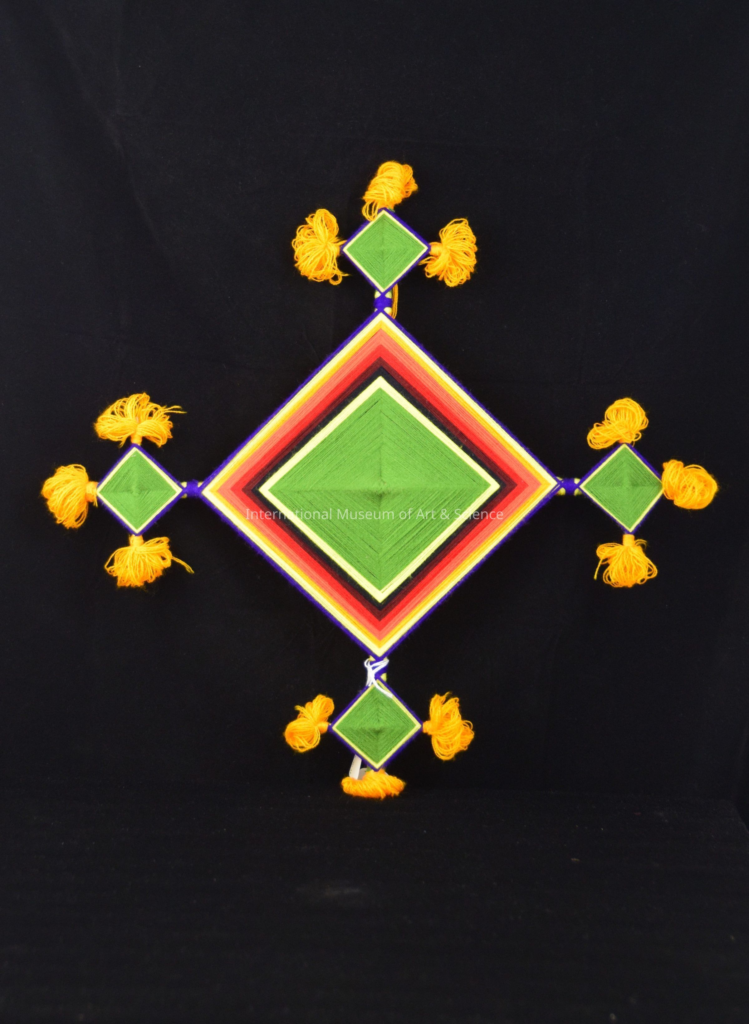 A 4 corner Ojo de Dios. A yarn woven ornament. 4 corner multi-colored with golden rod yarn tassels at each corner. Colors used are olive green, lime green, red, yellow, blue, brown, and black.Dimensions