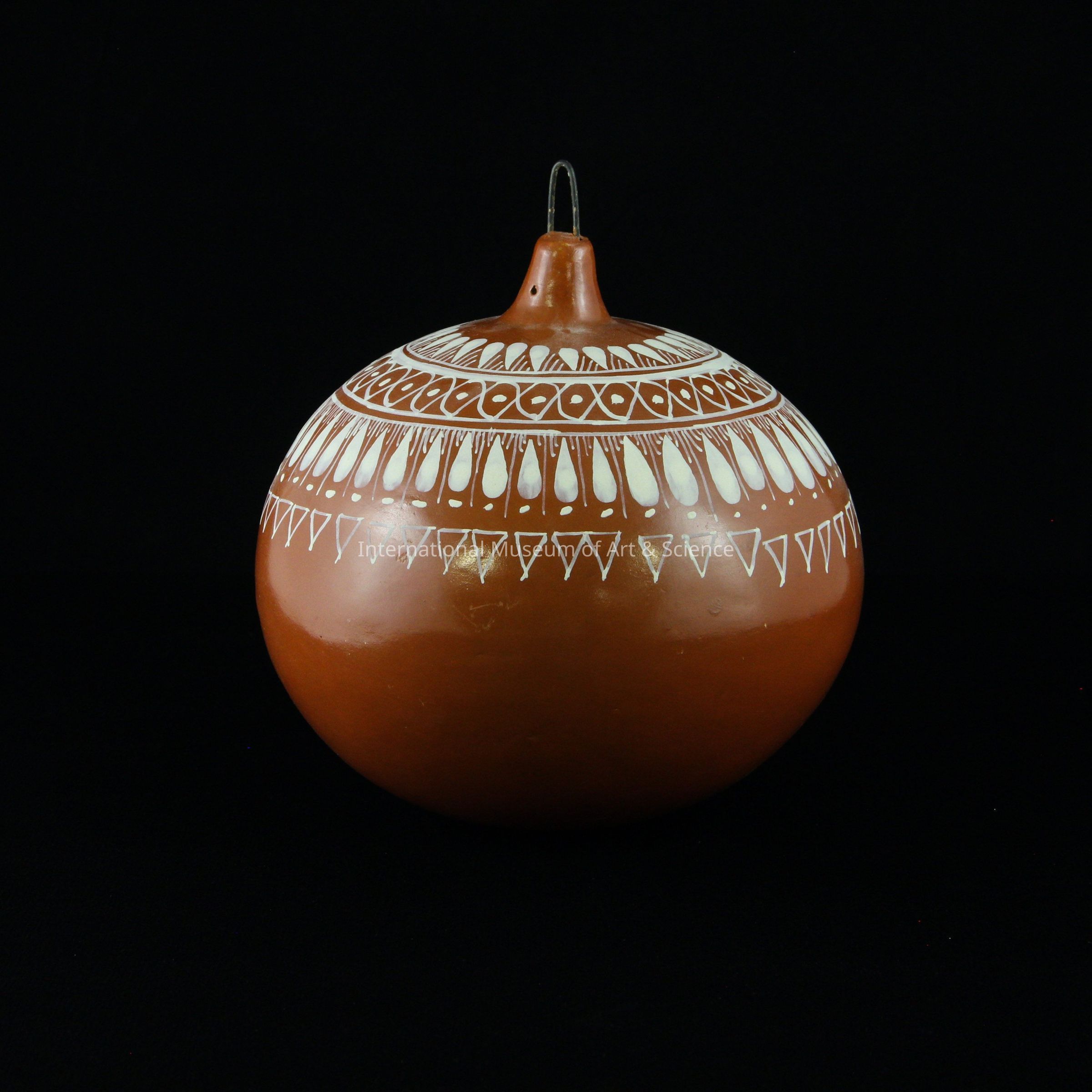 A ceramic spherical ornament. The ornament is a red/orange color with white designs painted onto the surface. The designs include: white tear drops, bands, oval chain links, triangles, and dots. The is a wire loop inserted in the top for hanging.Artwork Details