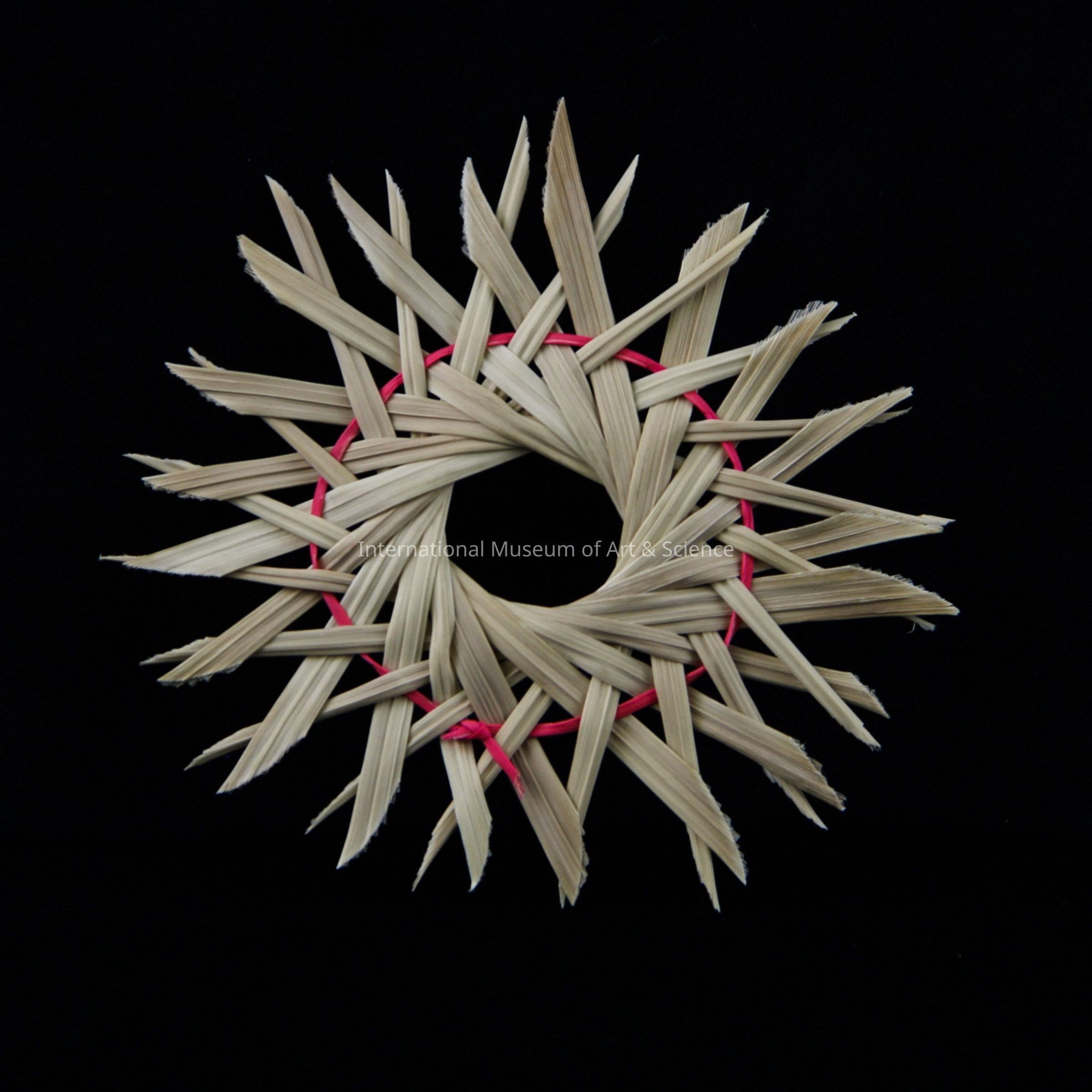 A wreath ornament woven from dried palm leaves. The circle of woven palm is trimmed with a pink string.