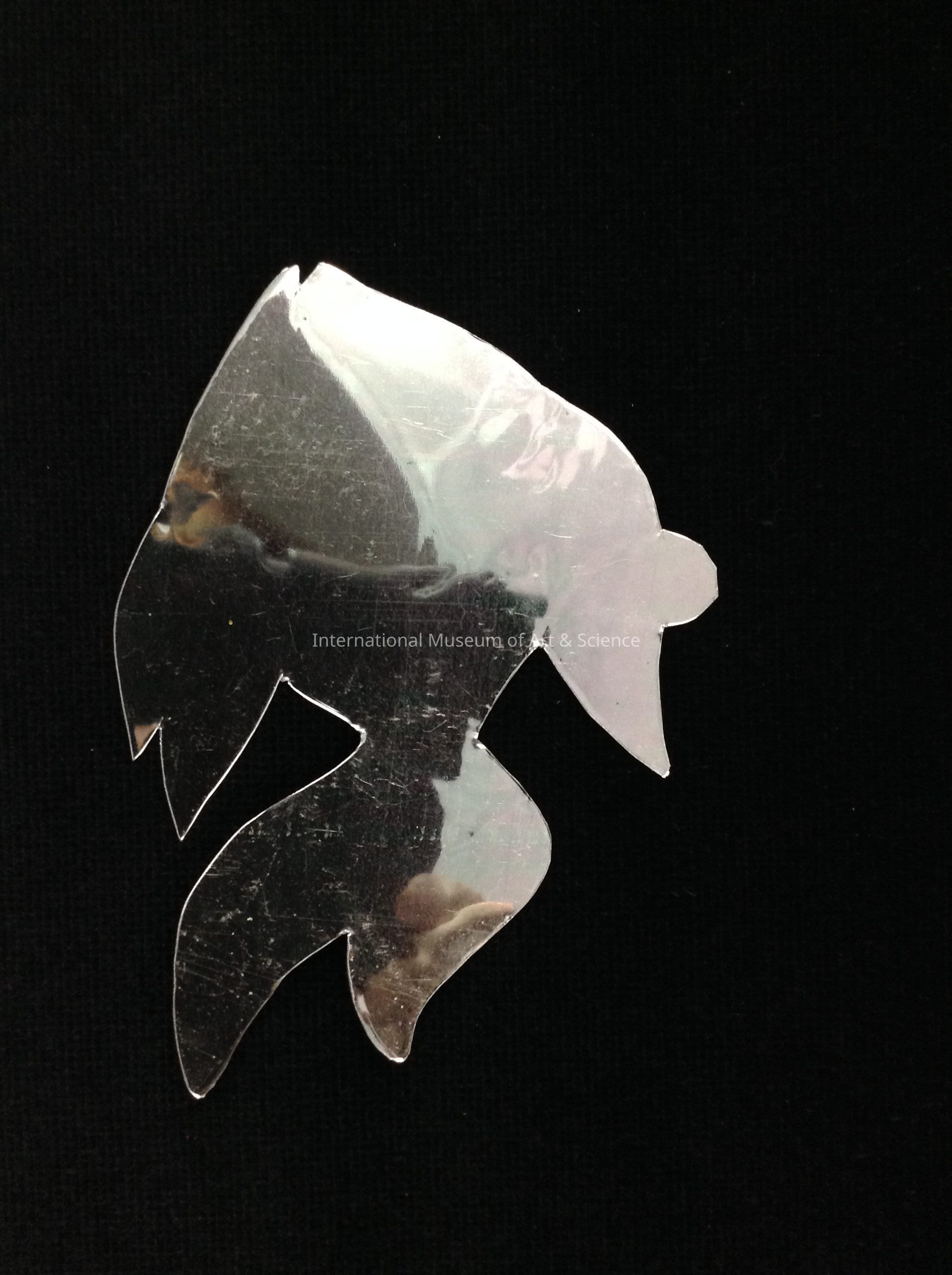A tin ornament in the shape of a fish. The fish is unpainted and unstamped. It is part of a set of 3 showing the process of creating a tin stamped ornament.Artwork Details